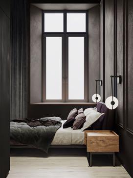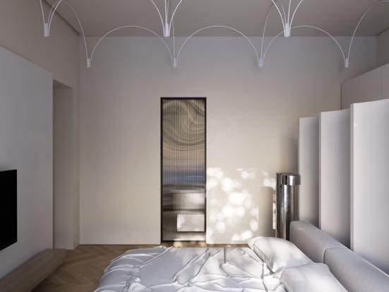 cabinet furniture in the bedroom has open structure which creates a sense of spaciousness while, above the bed, you can the designer lamps similar to solar