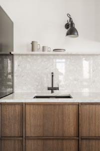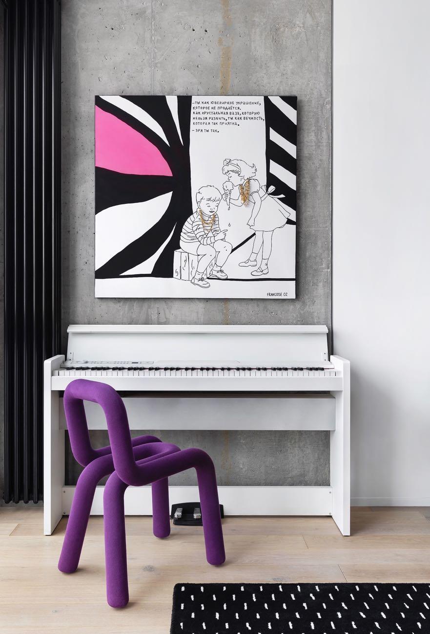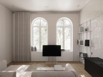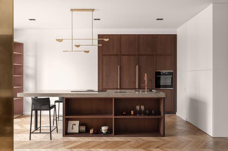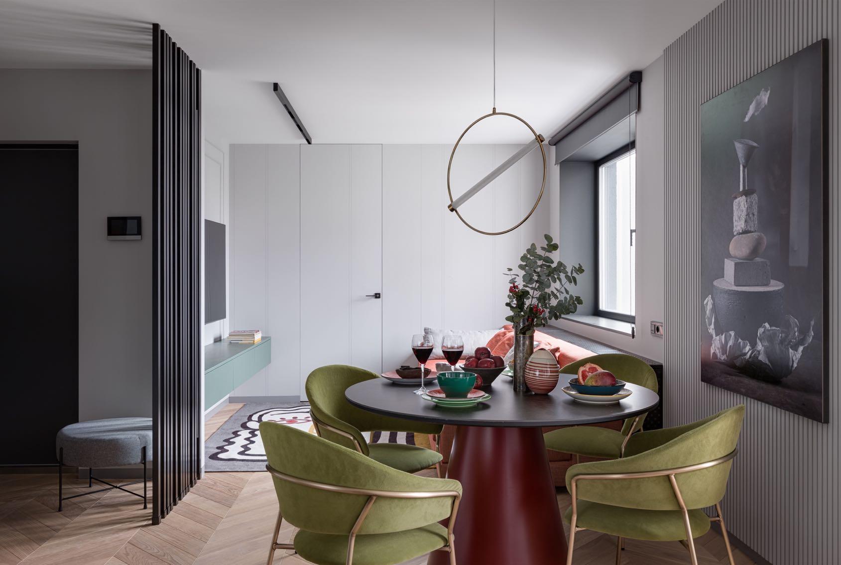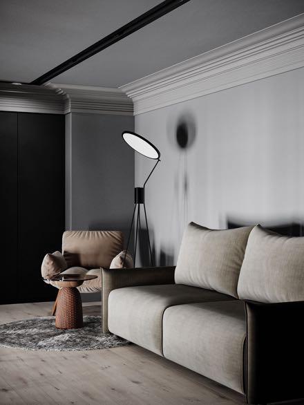 The balance between simplicity and complexity reflects the rational logic and philosophy of the studio in this project in Kyiv. Preferring an empty space, designers do not overload it with a large number of accents. Separate inserts of the subject design of furniture and lighting create a memorable image, while having the corresponding function.