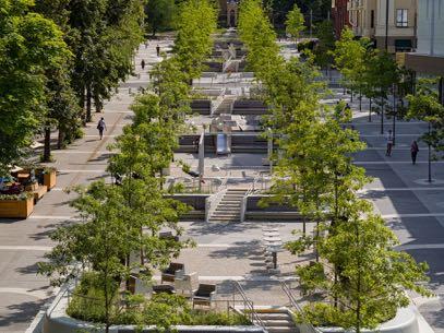 Boulevard Yuzhny by Filimonov & Kashirina architects // Dnipro City Located in the central district of the city, the implemented boulevard is a continuation of the previously formed pedestrian boulevard Ekaterinoslavsky. Yuzhny Boulevard is longitudinally divided into three zones: transit areas along the line of the building, functionally various zone in the middle (recreation, quiet rest areas, children’s playground). The main landscape dominant of the new pedestrian space is the stream, which stretches across the entire boulevard. It’s also the longest artificial creek in Ukraine. It symbolizes the underground river Zhabokryach, which flows right under the street.