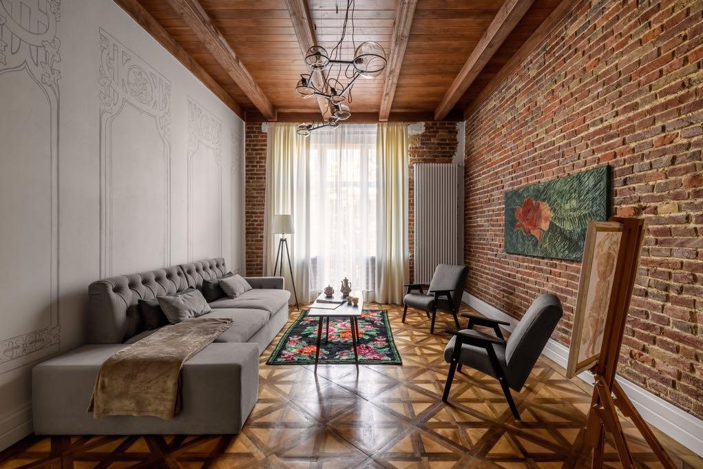 Light and shadows interact with the soft texture of the carpet and a comfortable sofa, creating the comfort of home space. Wood veneers and light gray textiles create a natural and warm spatial tint. The main subjects of illumination are Soviet and Dutch vintage. Un addition, pictures of local Kуiv artists fully interact with the interior, giving it a cultural and aesthetic weight.