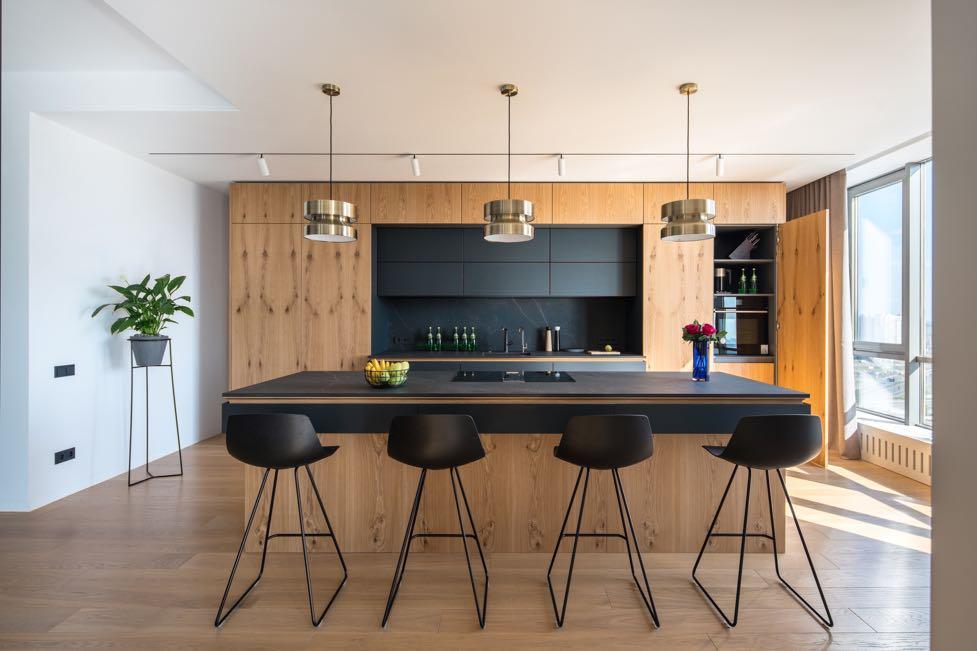 The apartment is located on the 26th floor with an amazing views of Kyiv. Begas Architectural Bureau followed the characteristics of the customer's style using traditional materials like wood, clay, glass