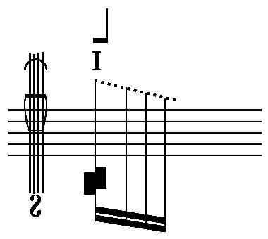 = "Bridge clef". It negates the traditional clefs and indicates the surface of the instrument: fingerboard - strings - bridge. It doesn't indi cate a specific pitch but the point on the instrument where an action is to be performed.
