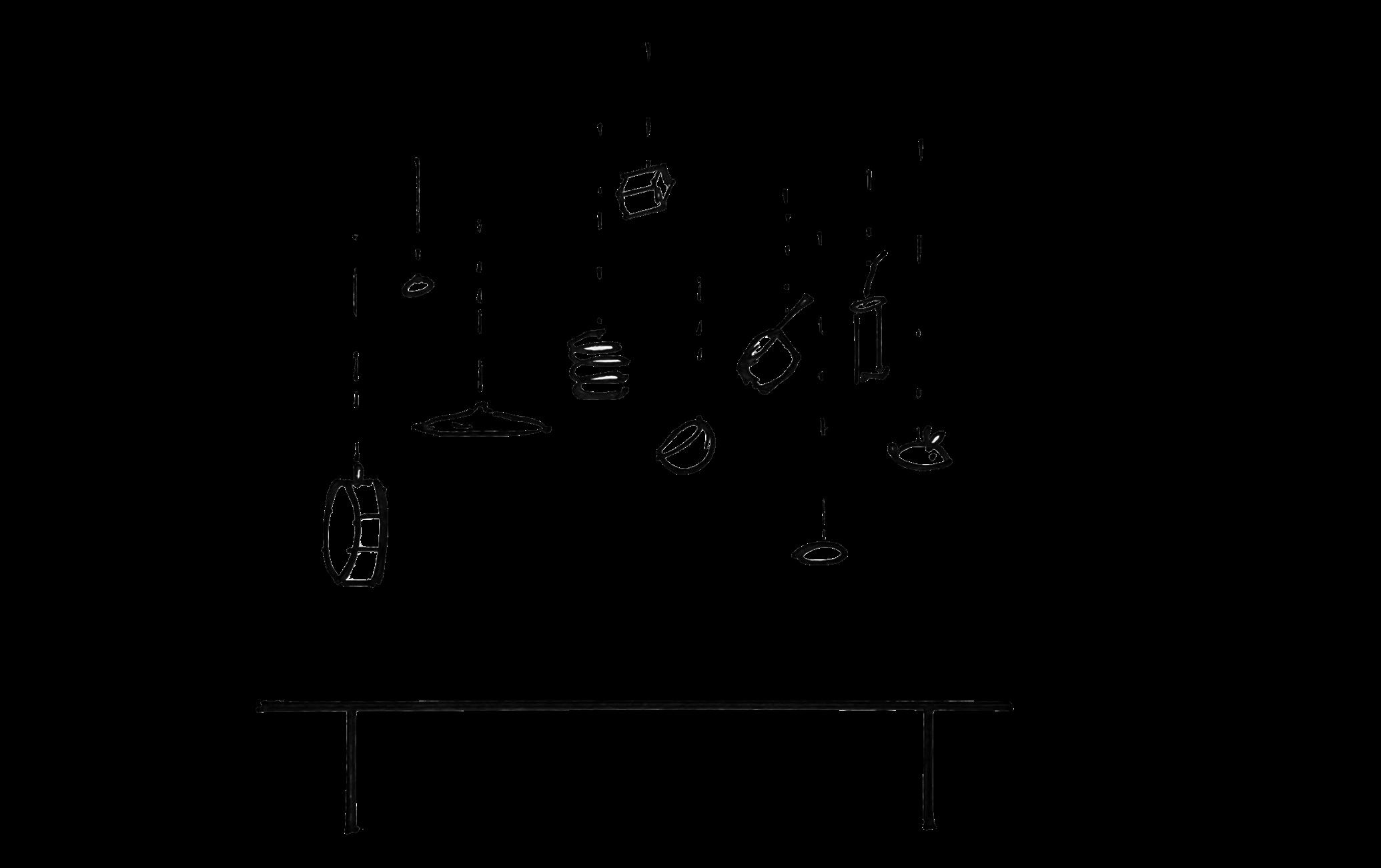 Suspend objects "in mid air" (ideally hang from invisible fly wires so it looks like they're magically floating in the air at different heights. Strike / play objects ad lib. e.g. cymbal