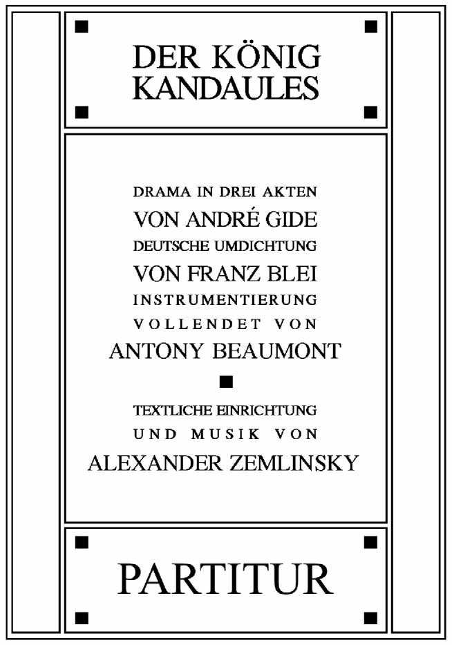 The complete short score of the opera Der König Kandaules is preserved amongst Zemlinsky’s posthumous papers. Further manuscript sources are: a handwritten transcript of Franz Blei’s German adaptation (partly in the hand of Louise Zemlinsky), numerous sketches and fragments, thirteen pages of vocal score and 137 pages of full score.