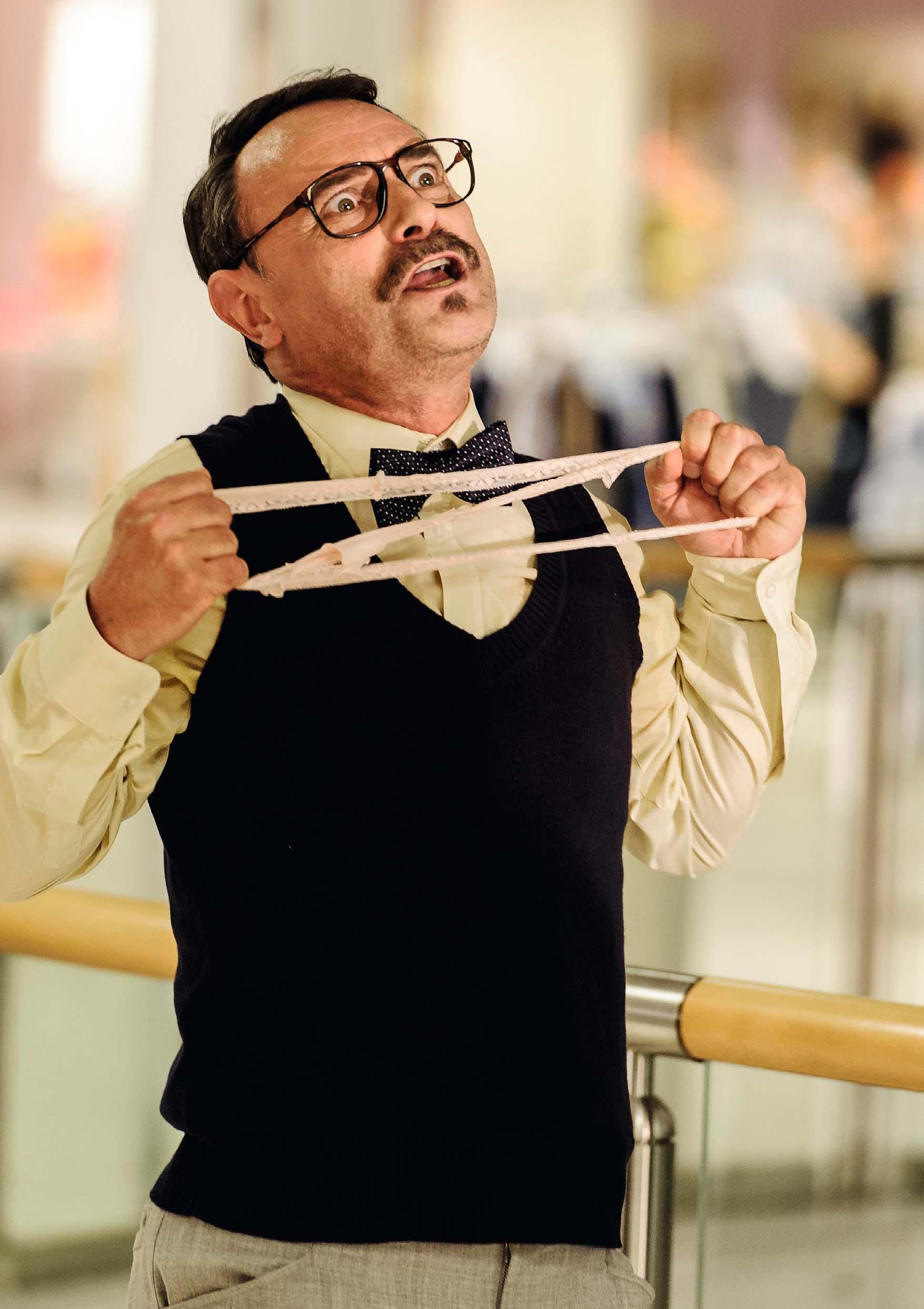 Nächste Prüfung: Ein Kunde erscheint mit großer Operngeste („O Isis und Osiris“). Er ist wütend darüber, dass sich ein Selbstbinder nicht von selbst um den Hals legt. Zudem empört er sich über die Weigerung einer Verkäuferin, sich vor seinen Augen zu entblößen und einen seidenen Damenschlüpfer anzuprobieren. Herr Plim, jetzt seinem Auftrag gemäß verzweifelt, niedergeschlagen und fassungslos, rührt aber den Herrn so sehr, dass er „Wertheim“ wegen Hartherzigkeit gegenüber Herrn Plim anklagt.