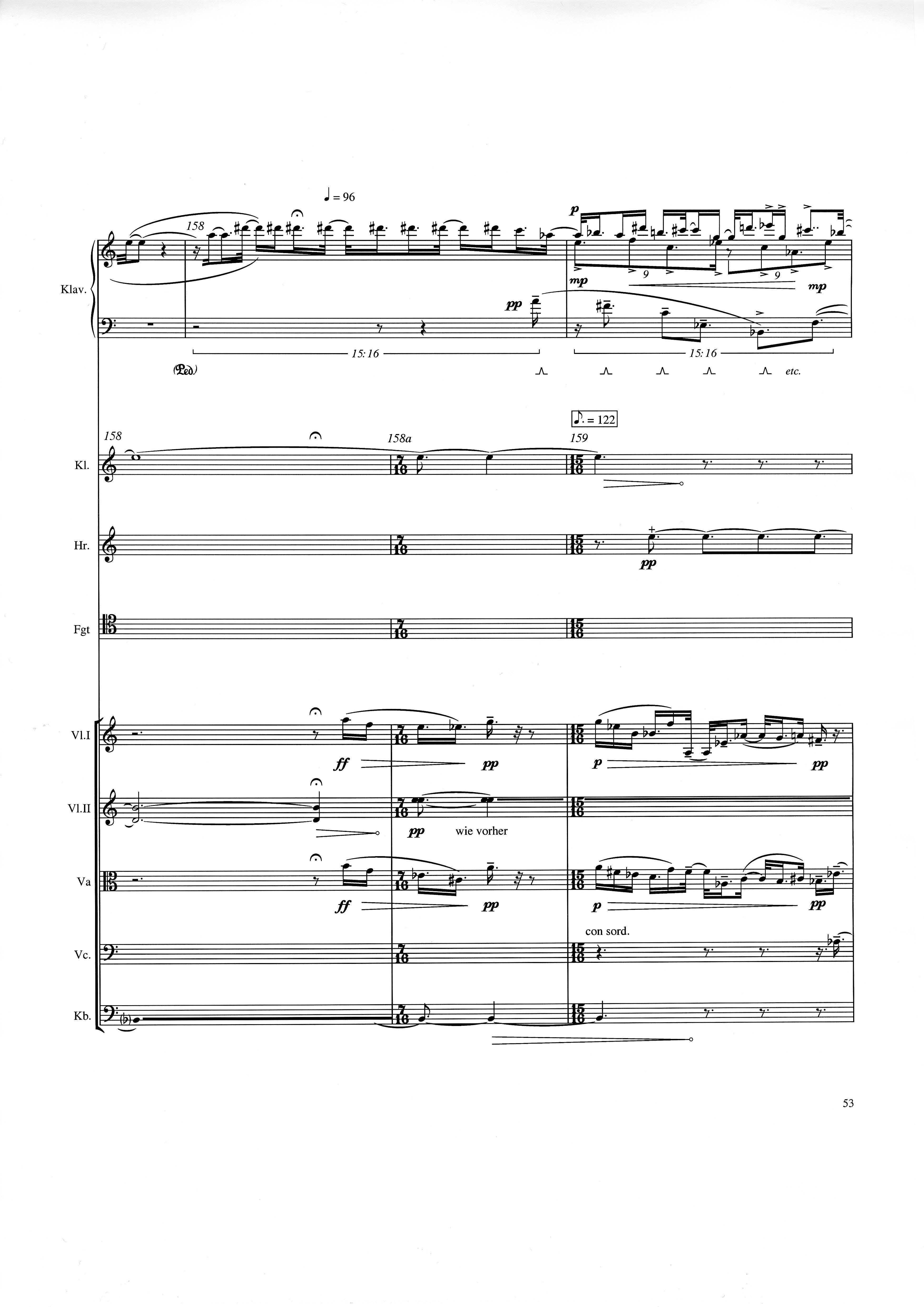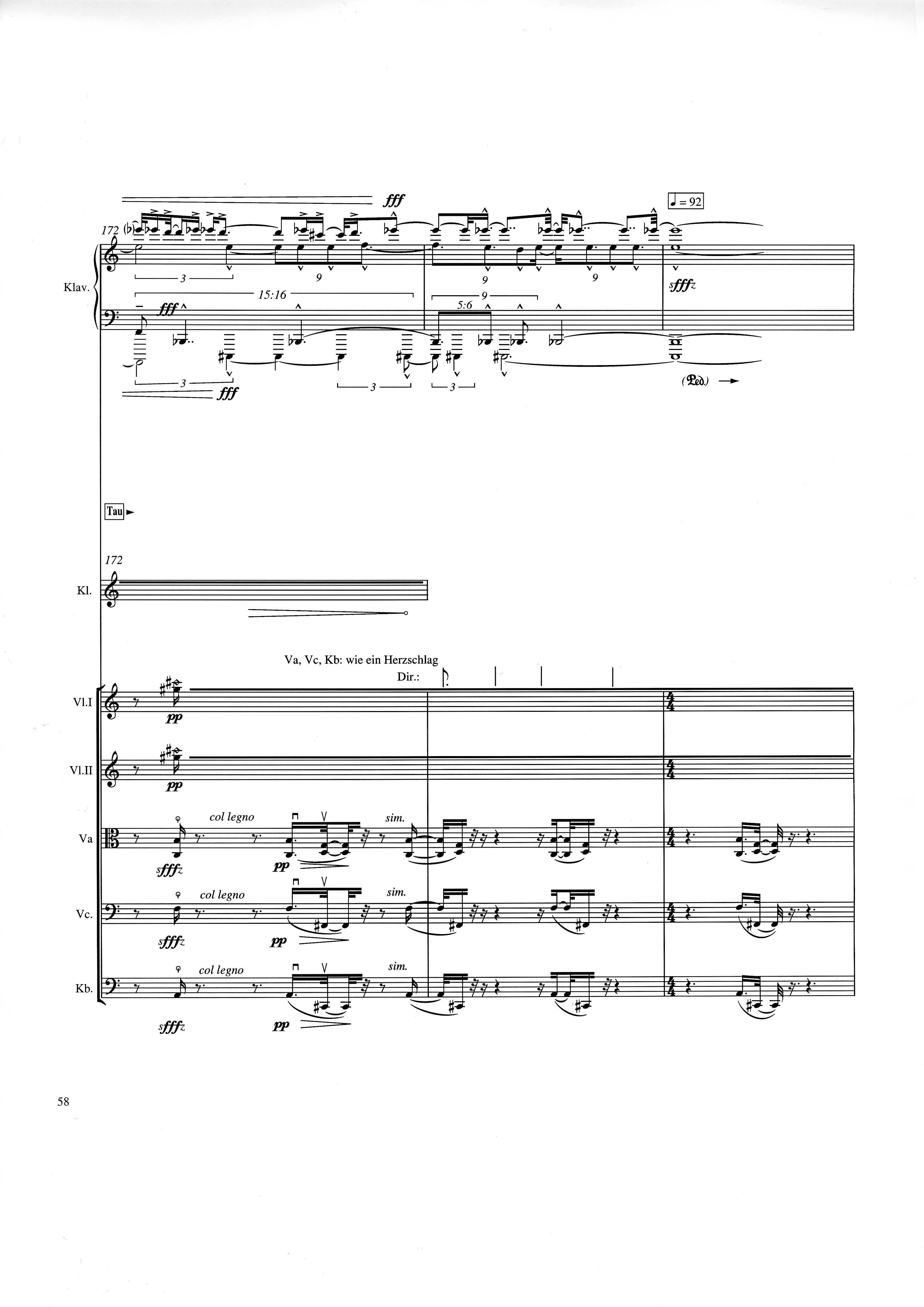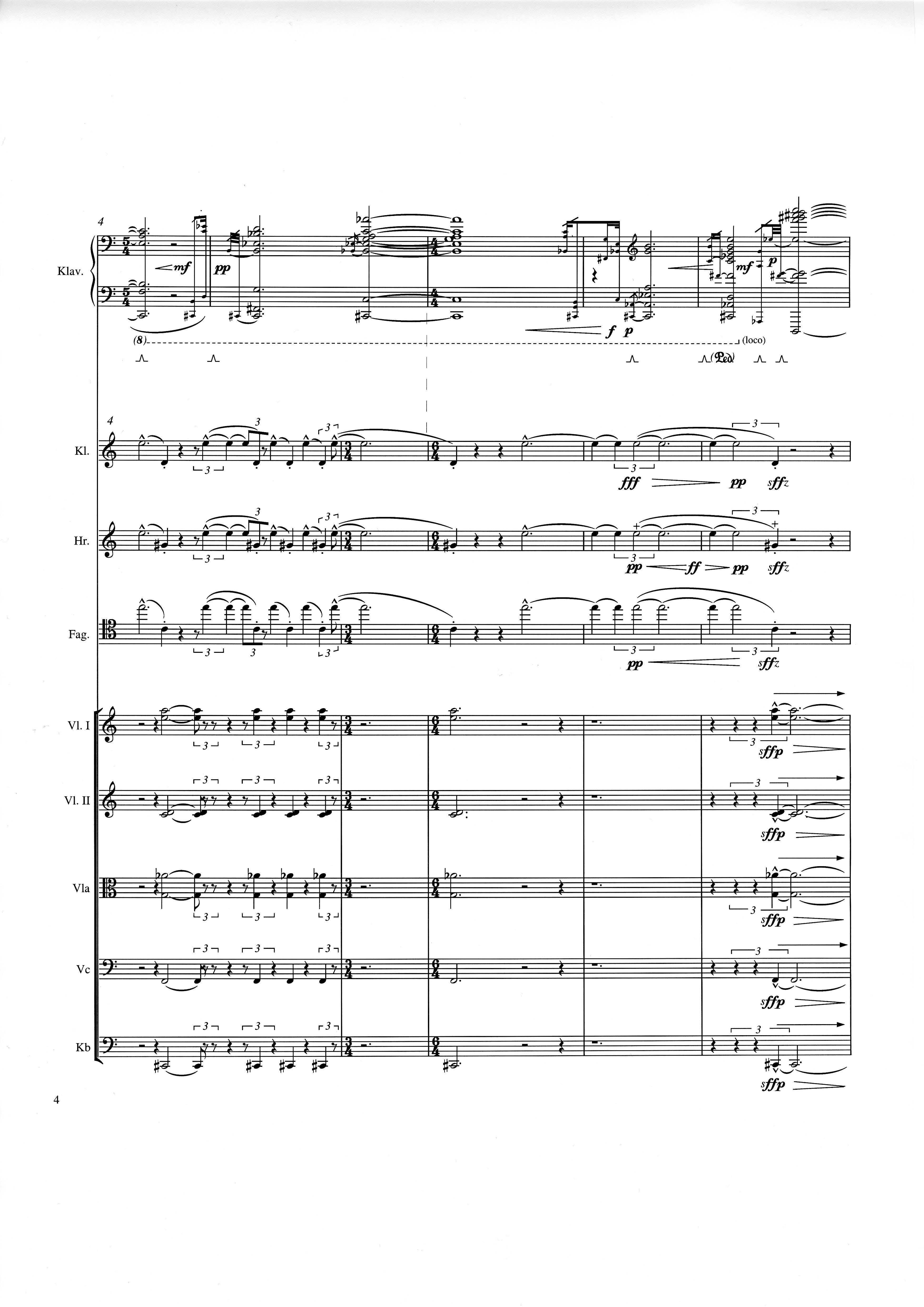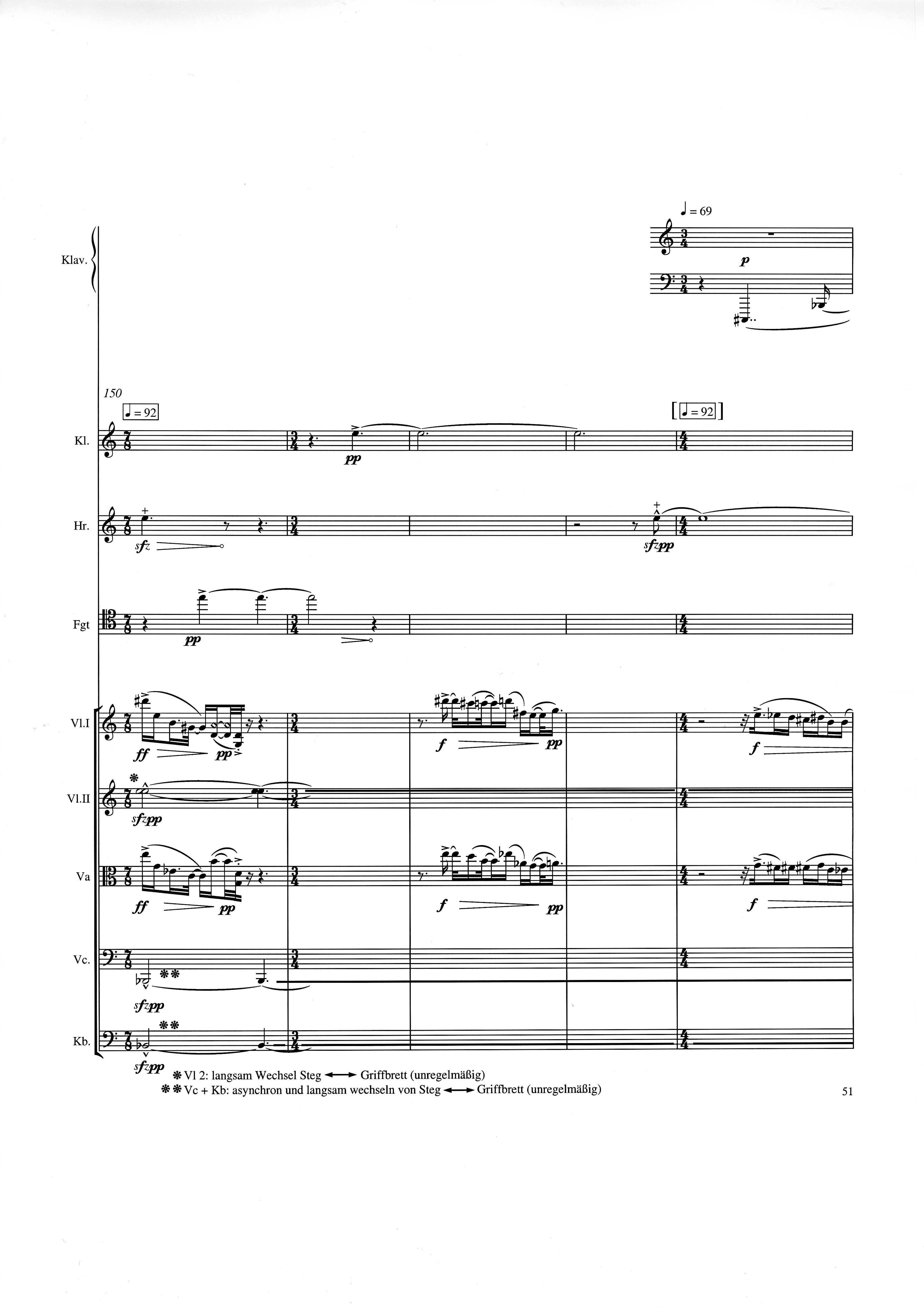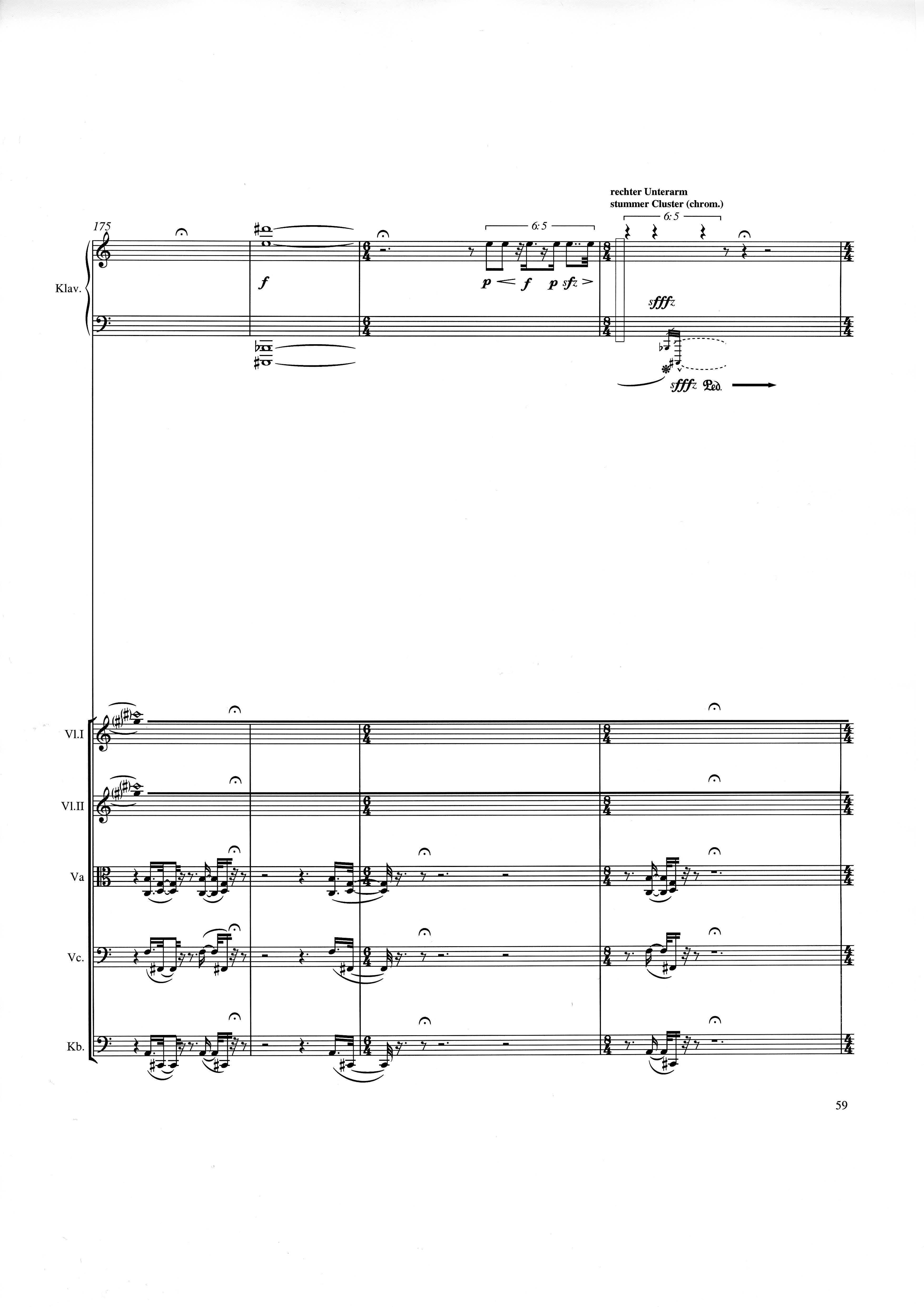 up (Klavierstück 4): Klavier solo down: Klarinette, Horn, Fagott, 2 Violinen, Viola, Violoncello, Kontrabaß strange: Klarinette (auch Baßklarinette), Harfe, Schlagzeug (Holztrommel, Große Trommel , Großes Becken) charm: shô (auch û), Violine [alternativ kann statt shô ein Akkordeon besetzt werden; die auf einem zusätzlichen System notierten Töne im Baßschlüssel]