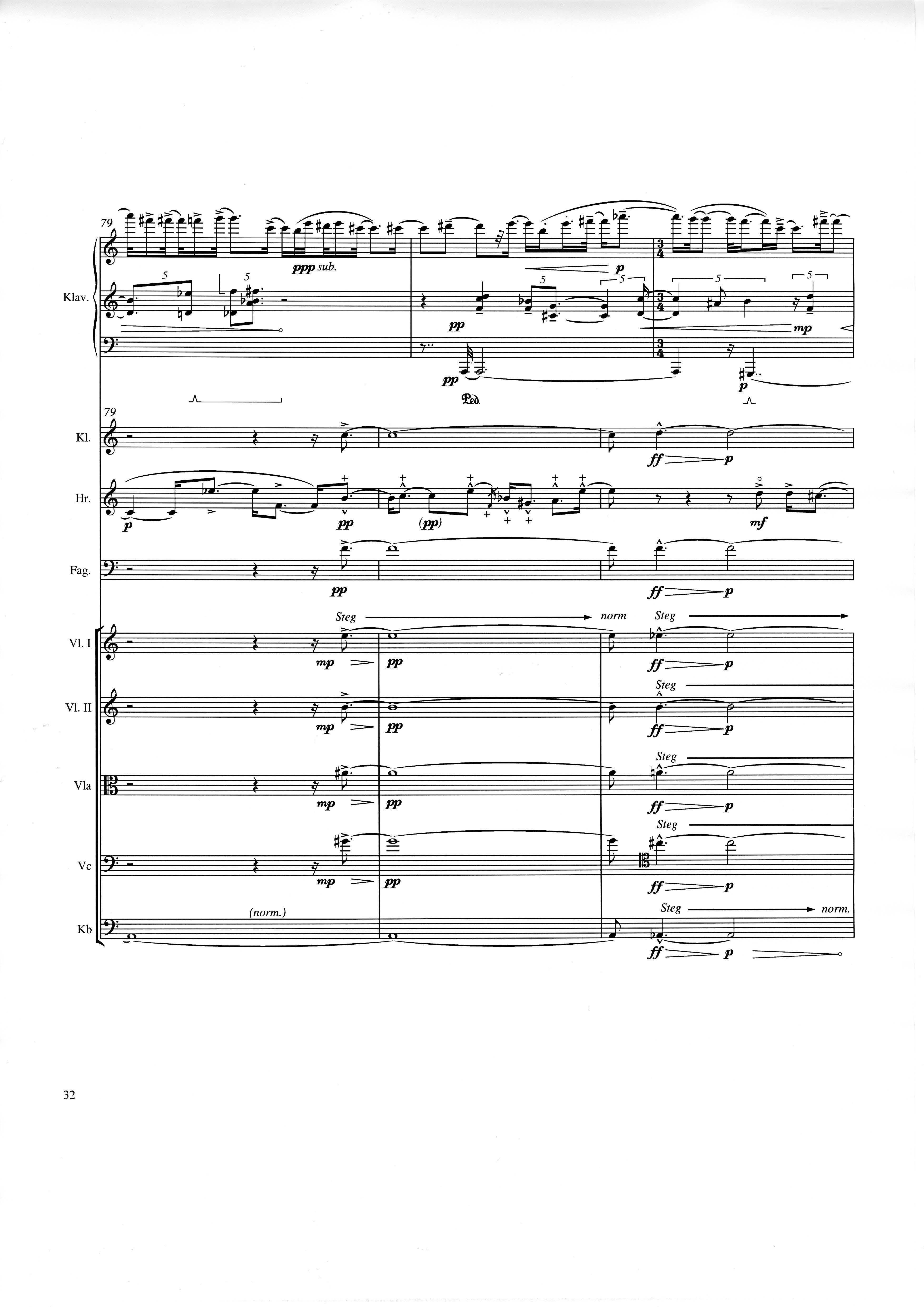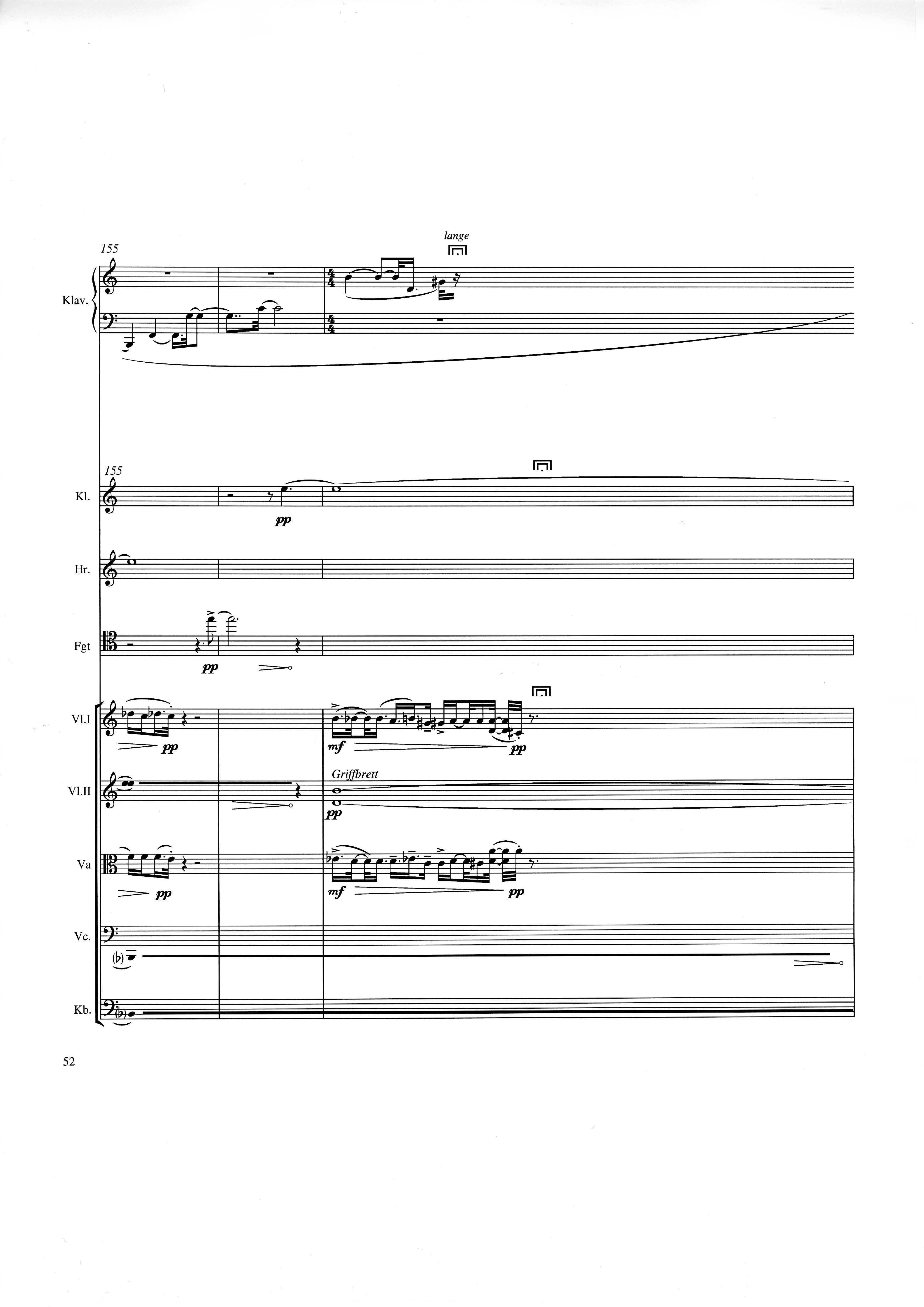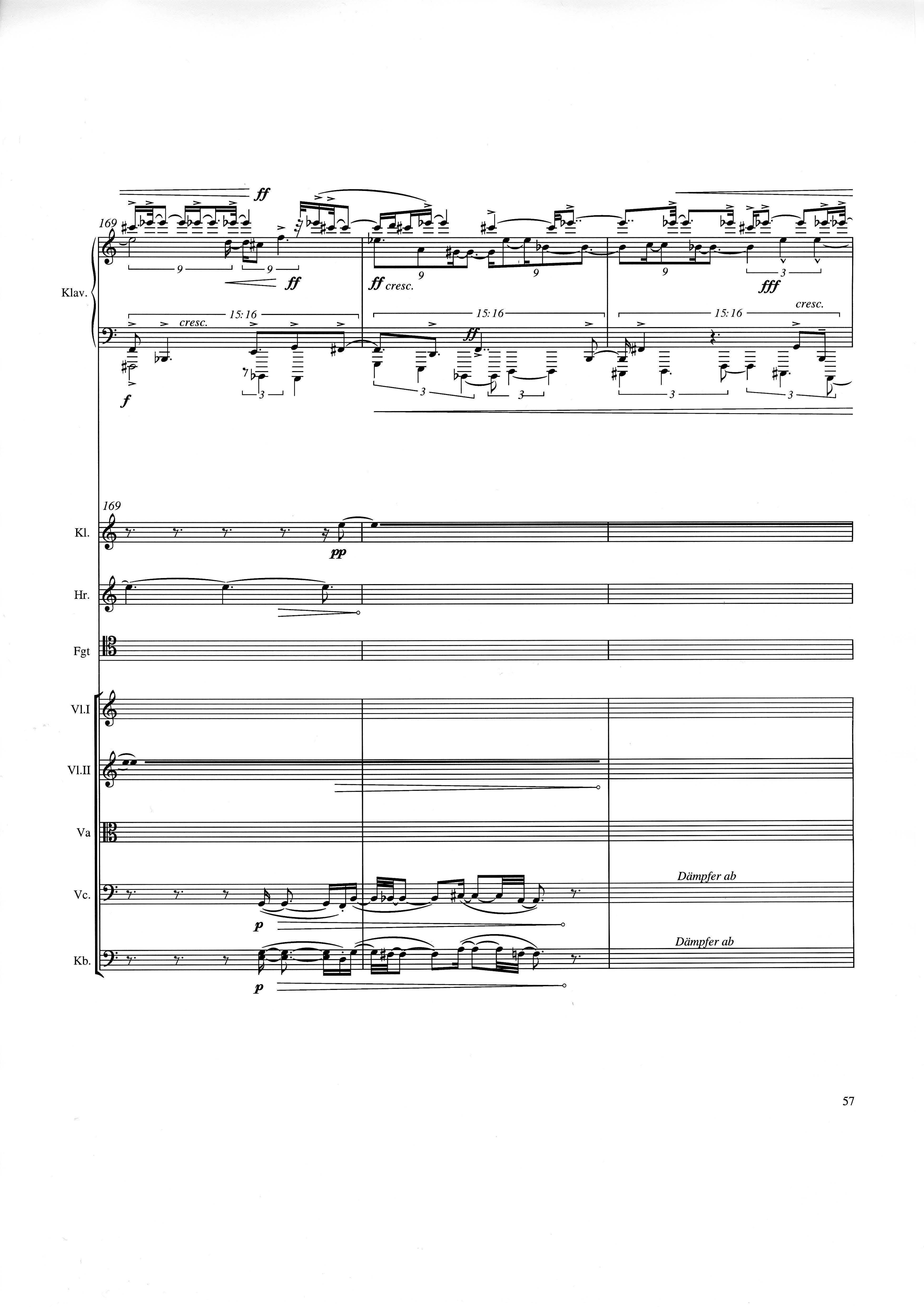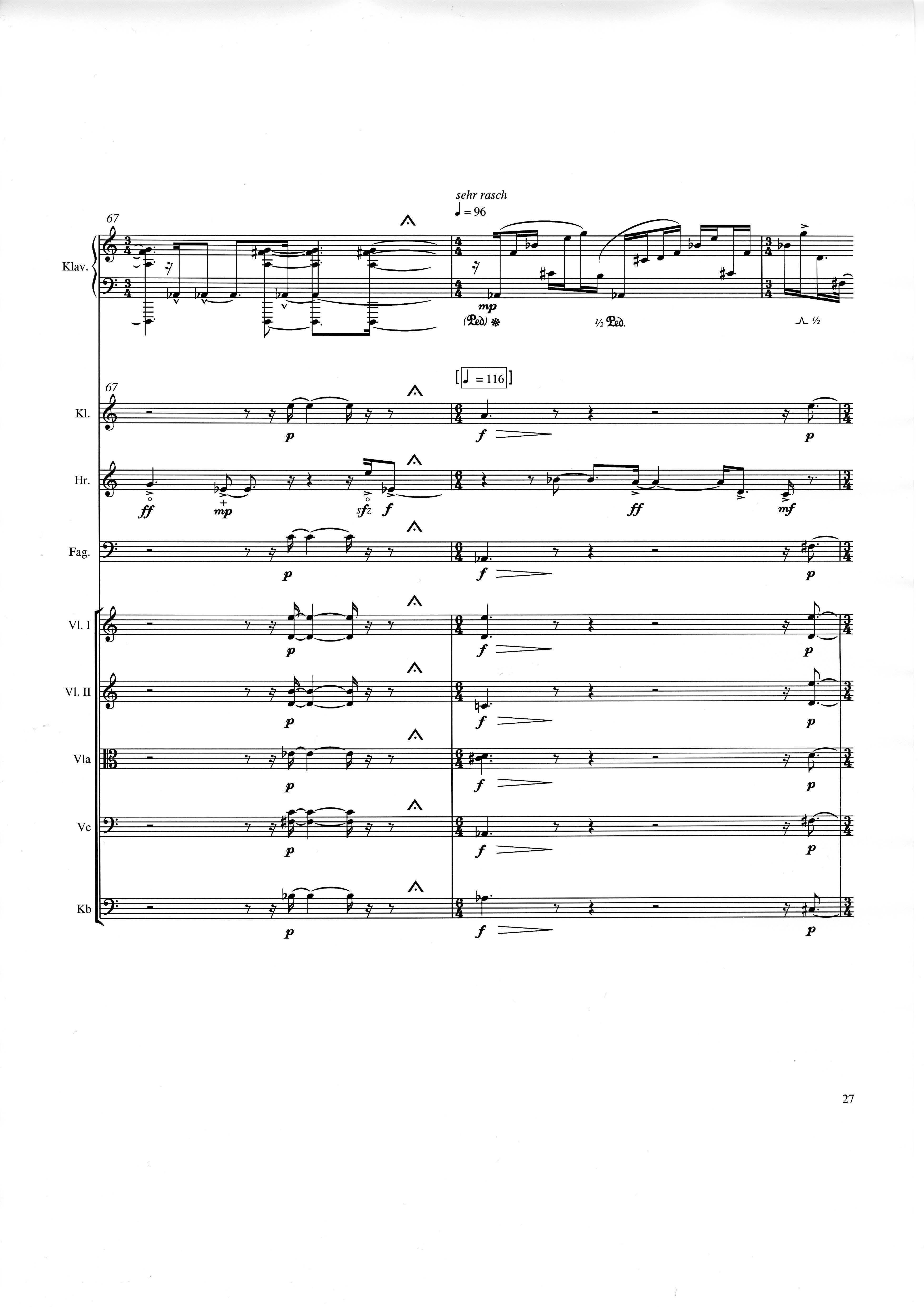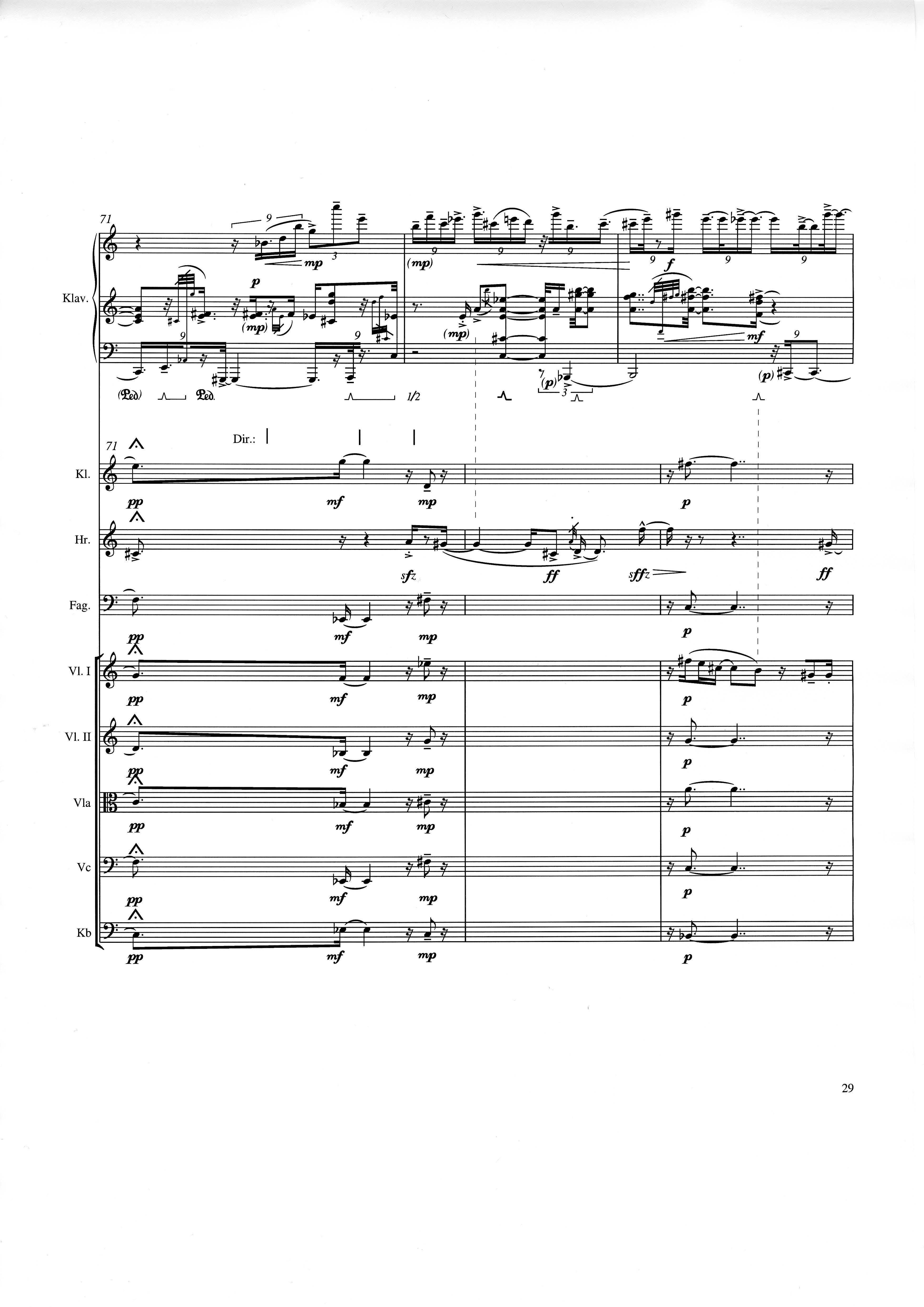 up (Klavierstück 4): Klavier solo down: Klarinette, Horn, Fagott, 2 Violinen, Viola, Violoncello, Kontrabaß strange: Klarinette (auch Baßklarinette), Harfe, Schlagzeug (Holztrommel, Große Trommel , Großes Becken) charm: shô (auch û), Violine [alternativ kann statt shô ein Akkordeon besetzt werden; die auf einem zusätzlichen System notierten Töne im Baßschlüssel]