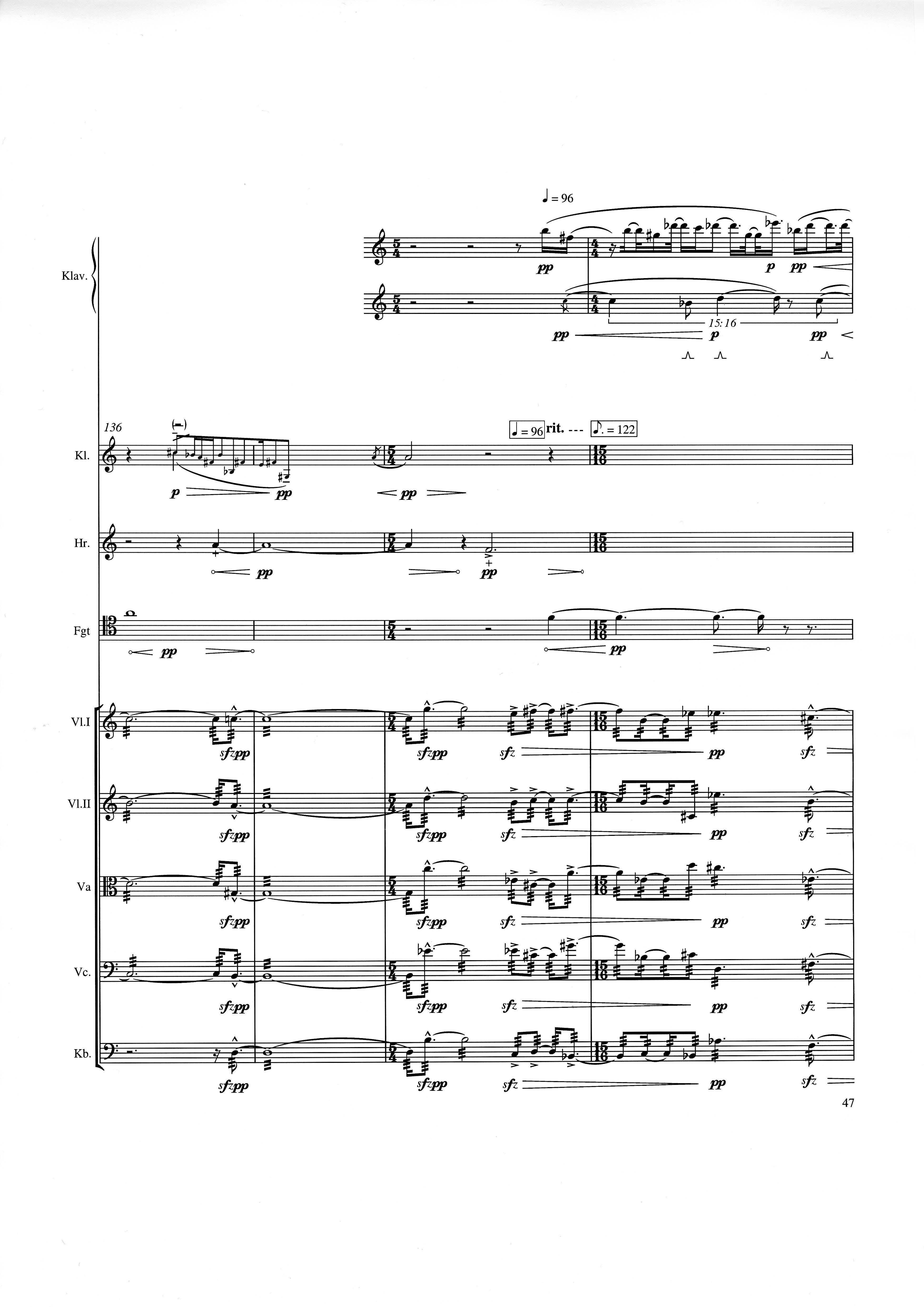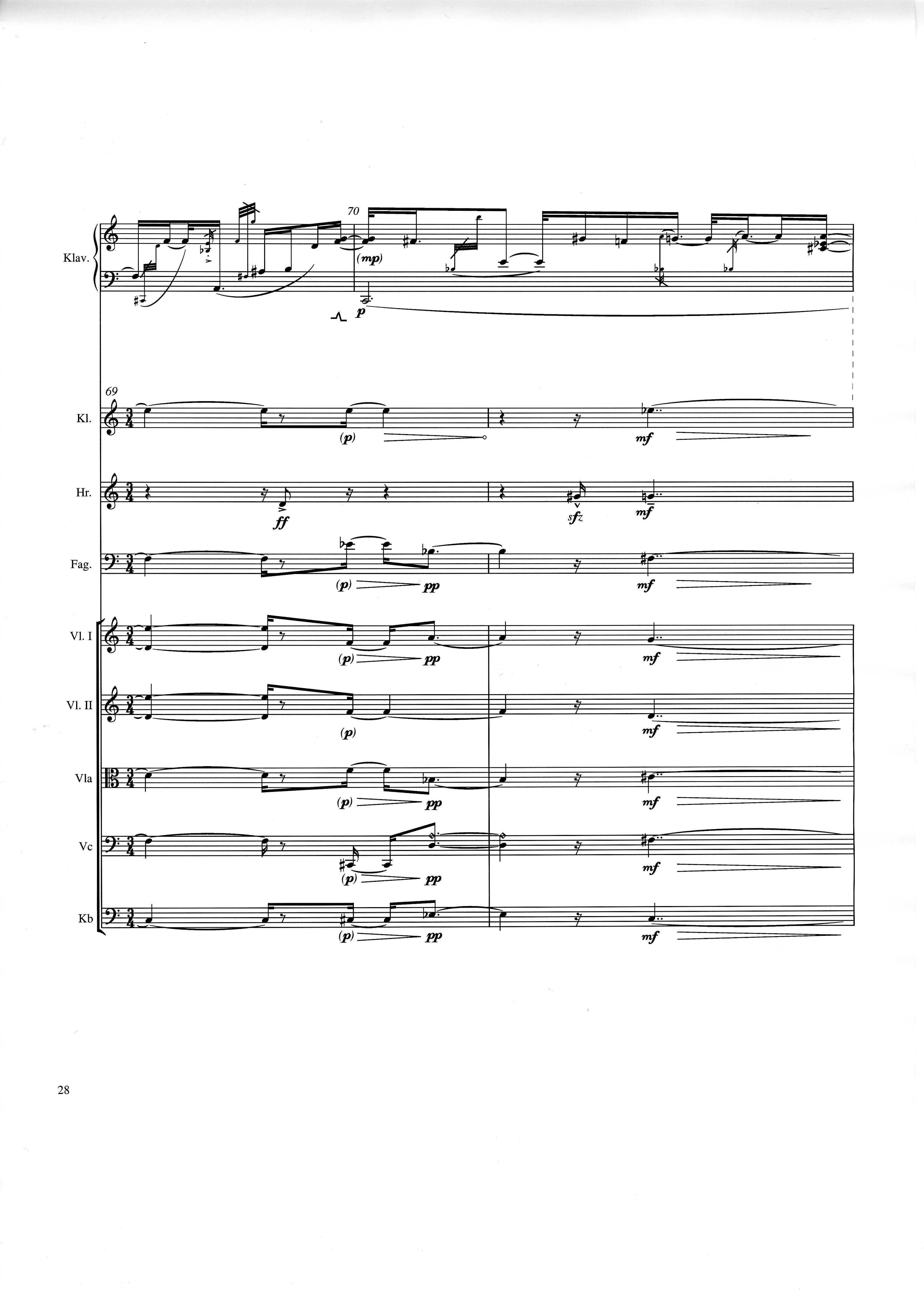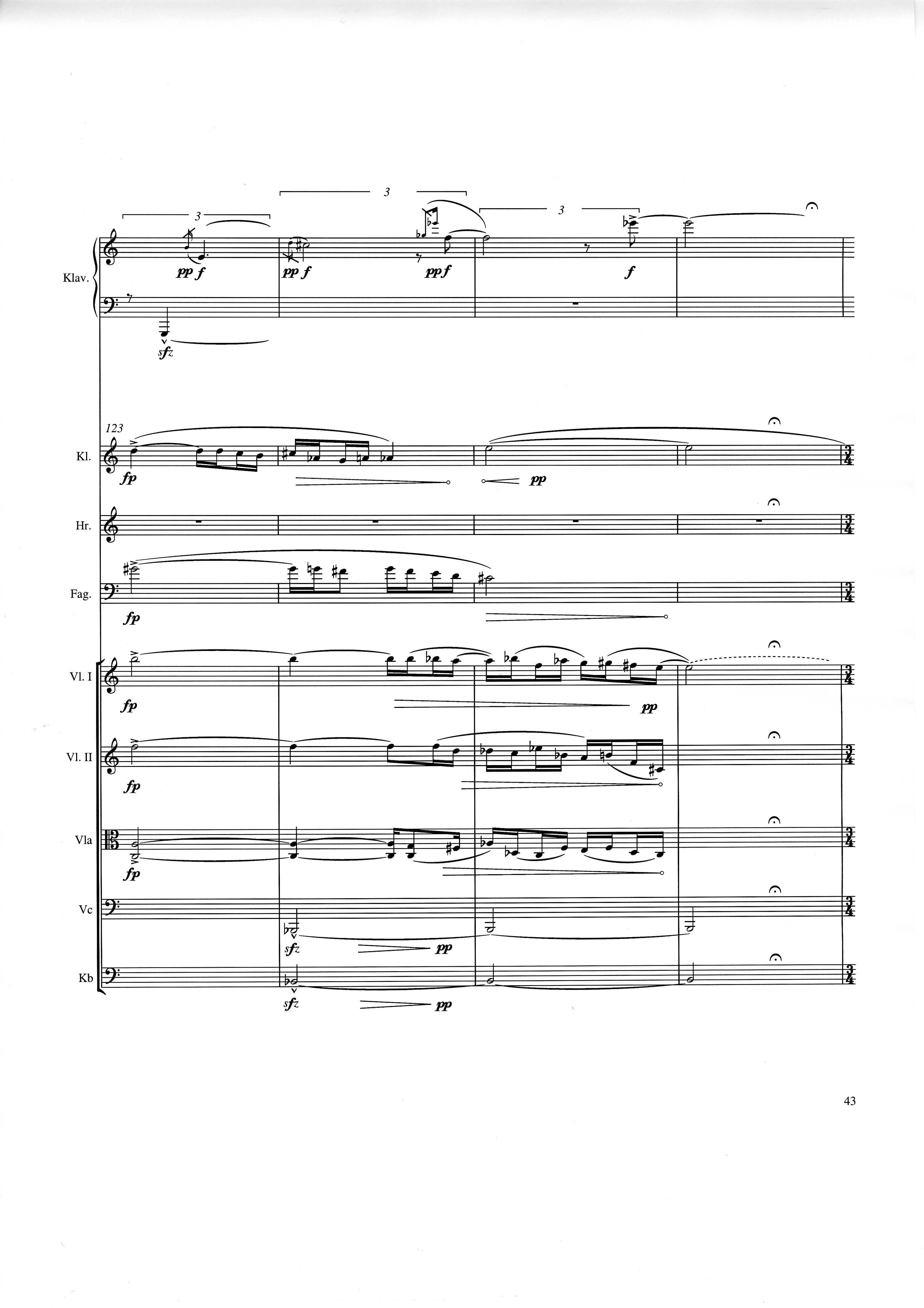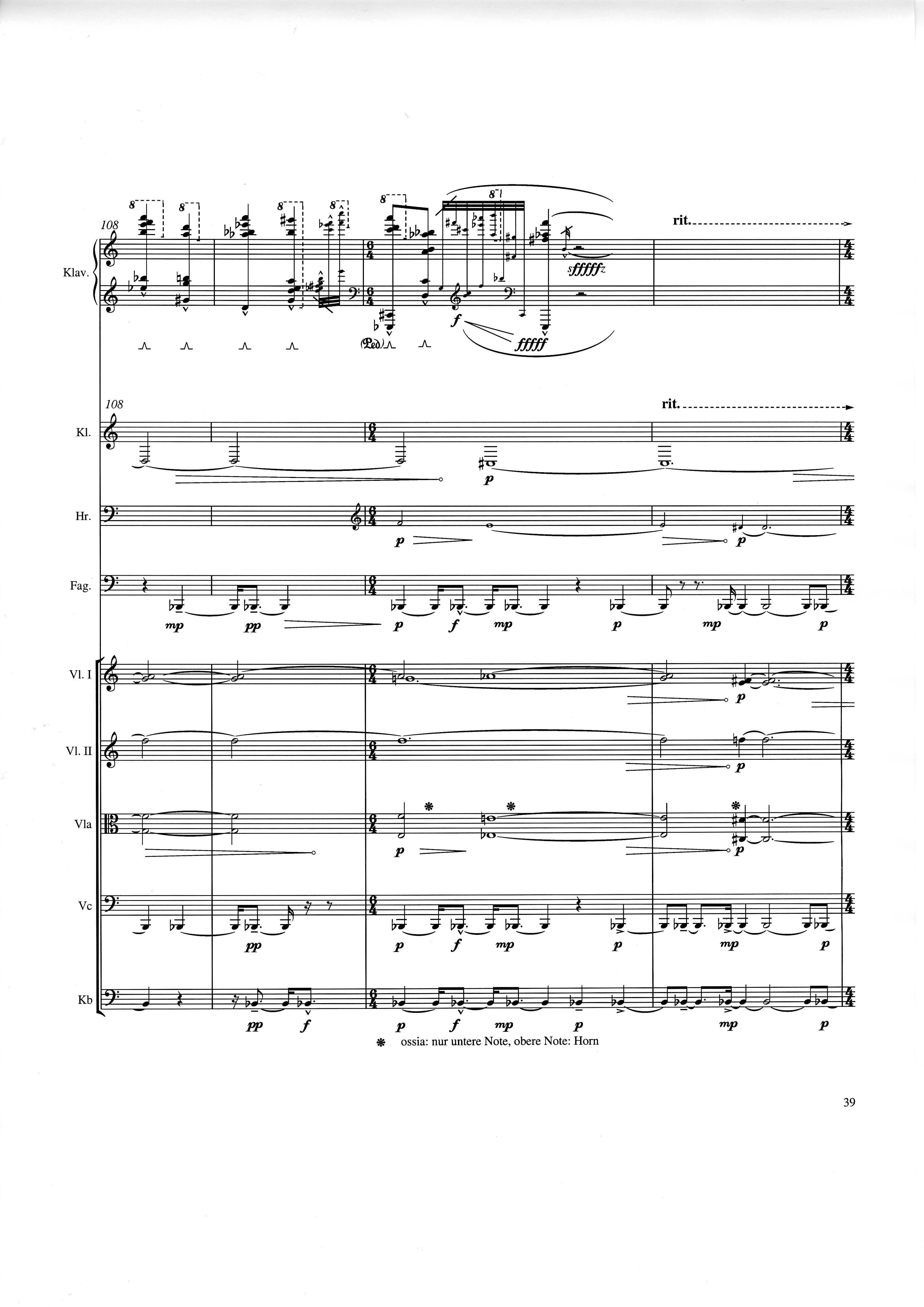 up (Klavierstück 4): Klavier solo down: Klarinette, Horn, Fagott, 2 Violinen, Viola, Violoncello, Kontrabaß strange: Klarinette (auch Baßklarinette), Harfe, Schlagzeug (Holztrommel, Große Trommel , Großes Becken) charm: shô (auch û), Violine [alternativ kann statt shô ein Akkordeon besetzt werden; die auf einem zusätzlichen System notierten Töne im Baßschlüssel]