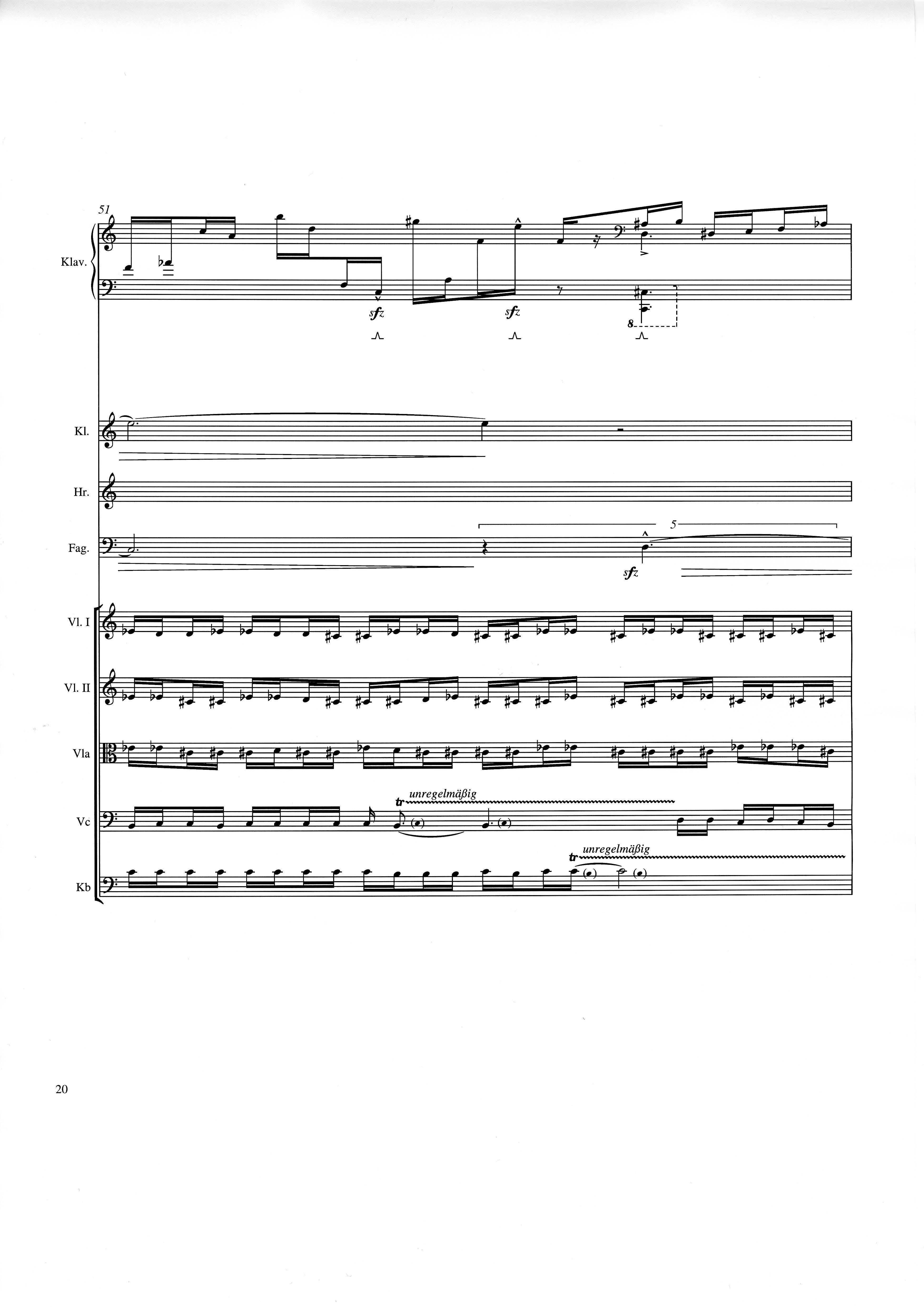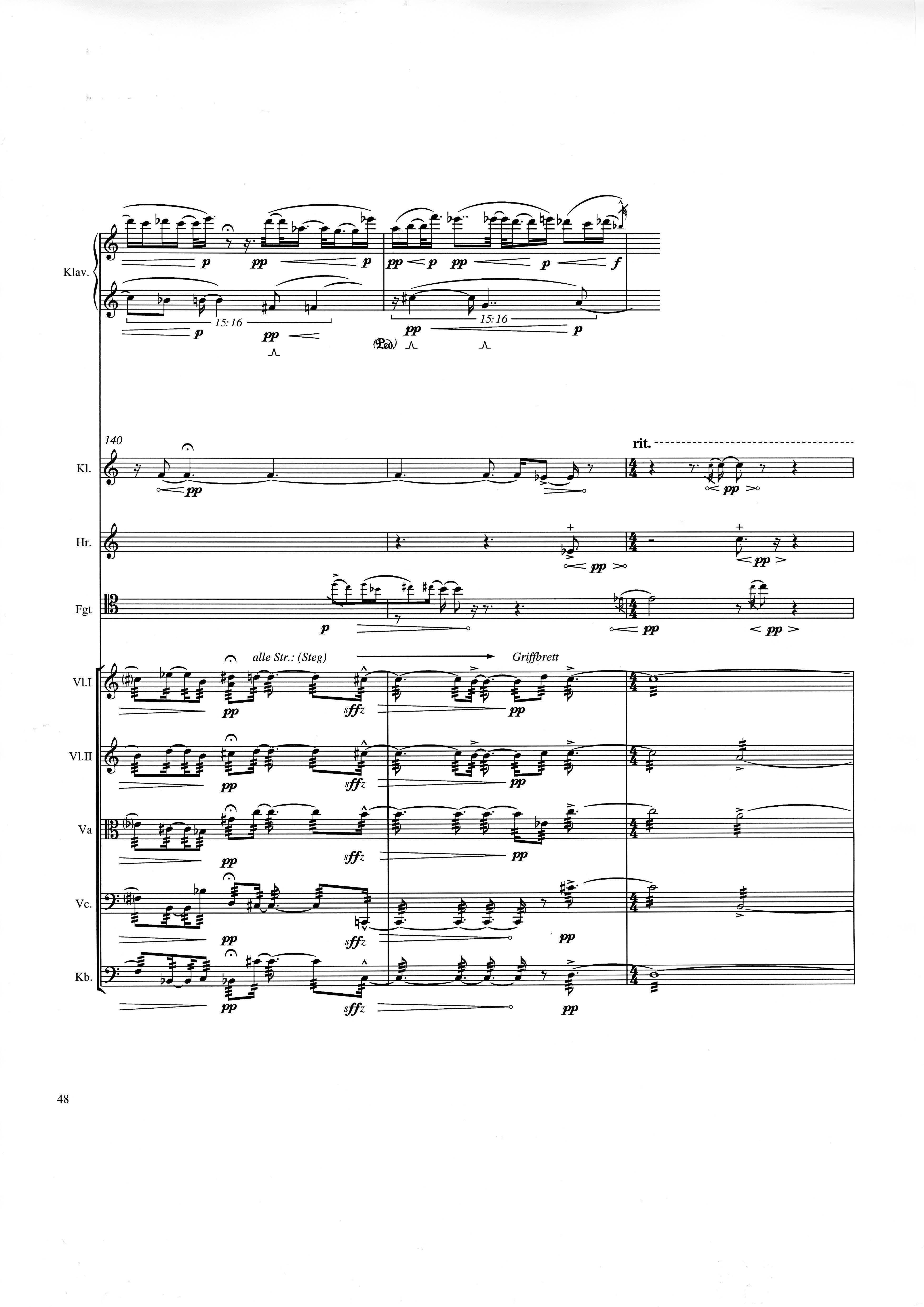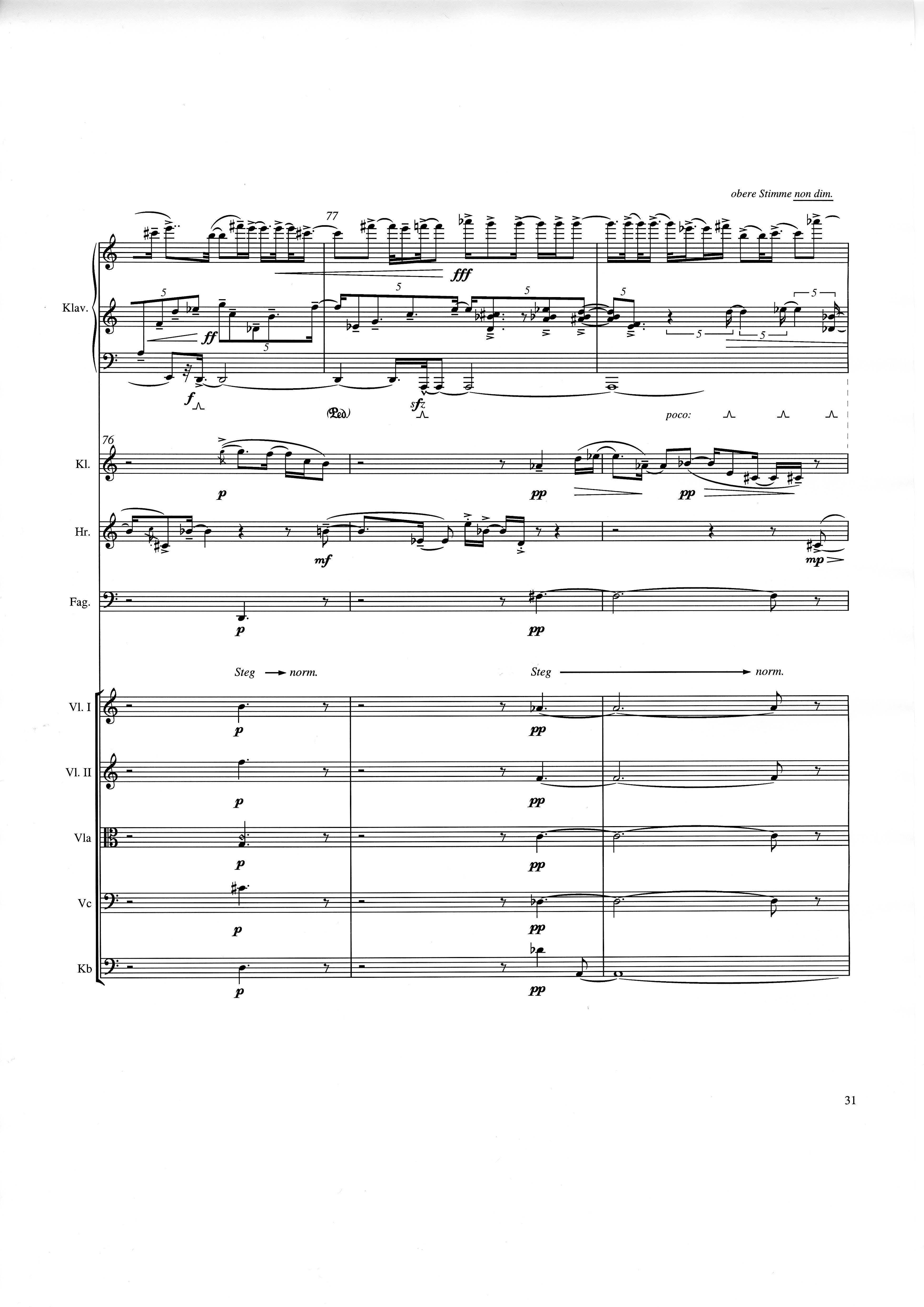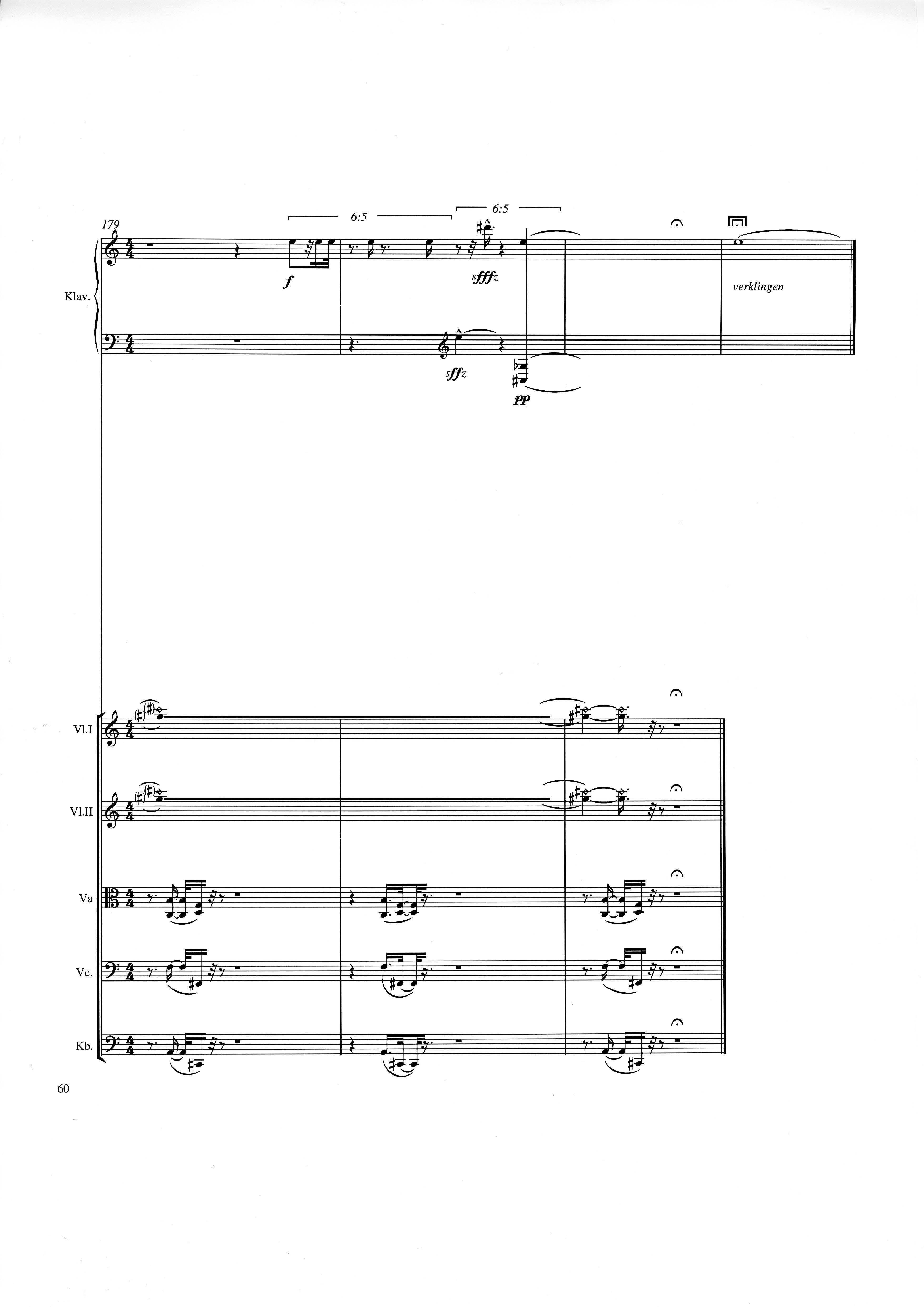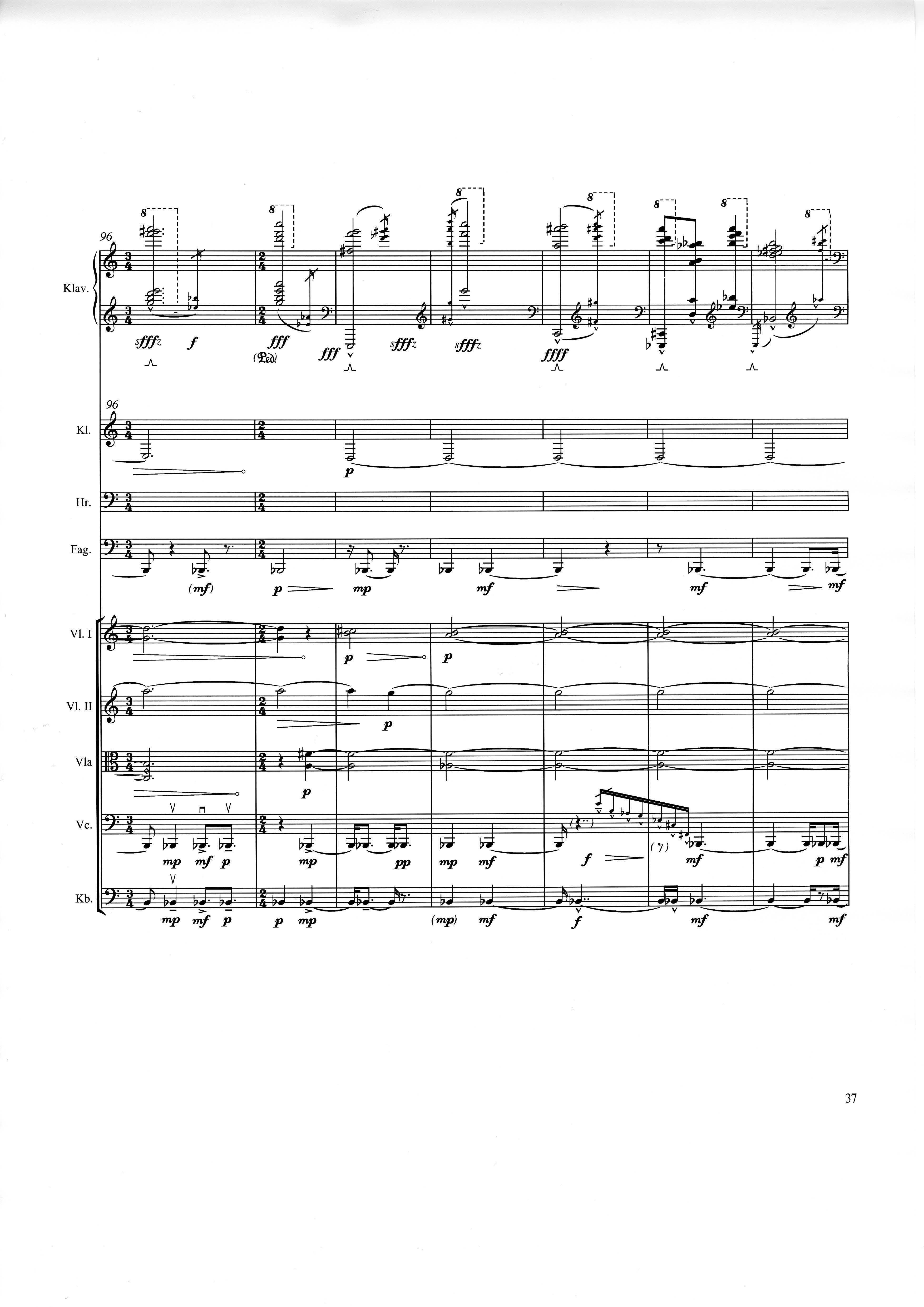 up (Klavierstück 4): Klavier solo down: Klarinette, Horn, Fagott, 2 Violinen, Viola, Violoncello, Kontrabaß strange: Klarinette (auch Baßklarinette), Harfe, Schlagzeug (Holztrommel, Große Trommel , Großes Becken) charm: shô (auch û), Violine [alternativ kann statt shô ein Akkordeon besetzt werden; die auf einem zusätzlichen System notierten Töne im Baßschlüssel]