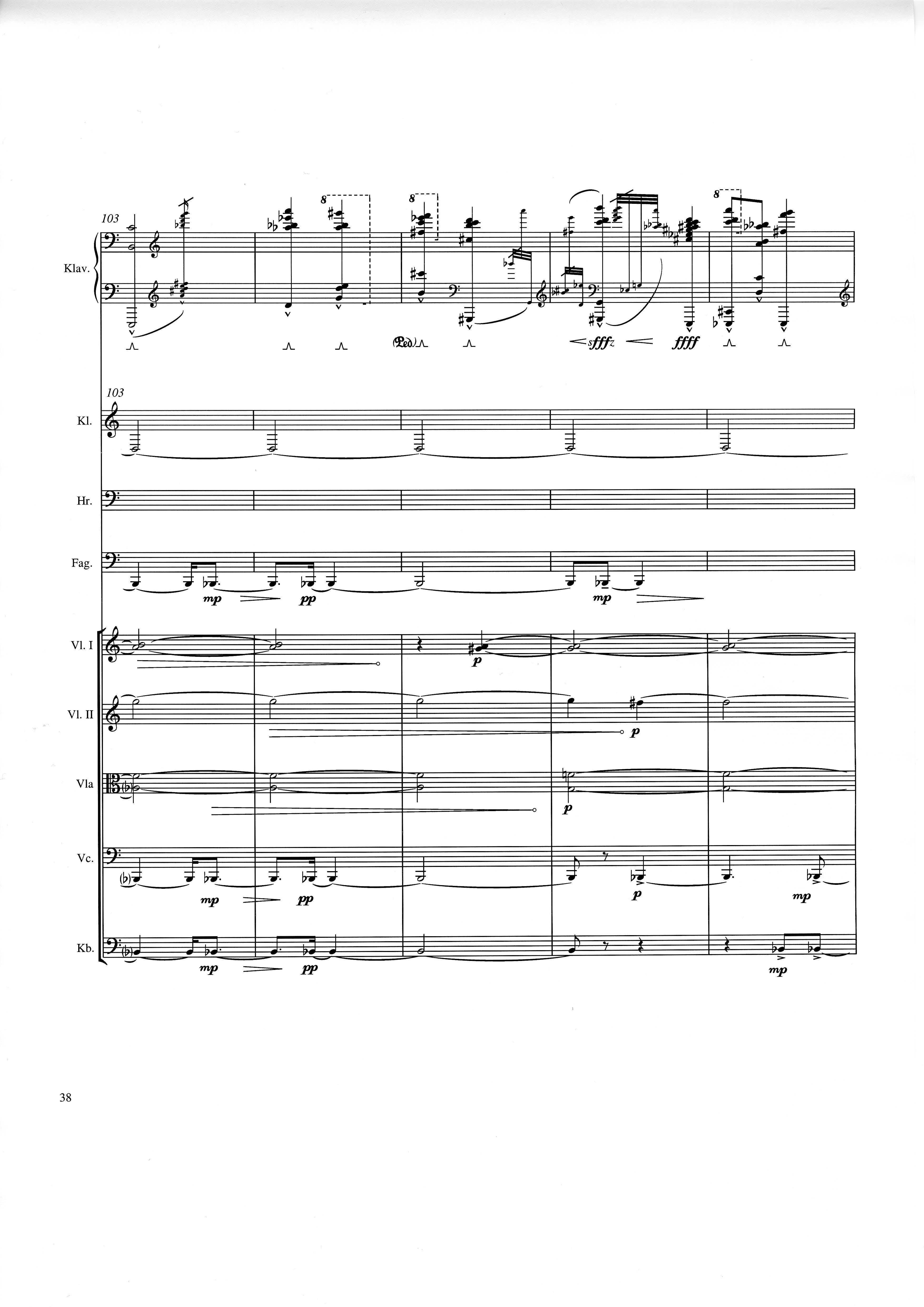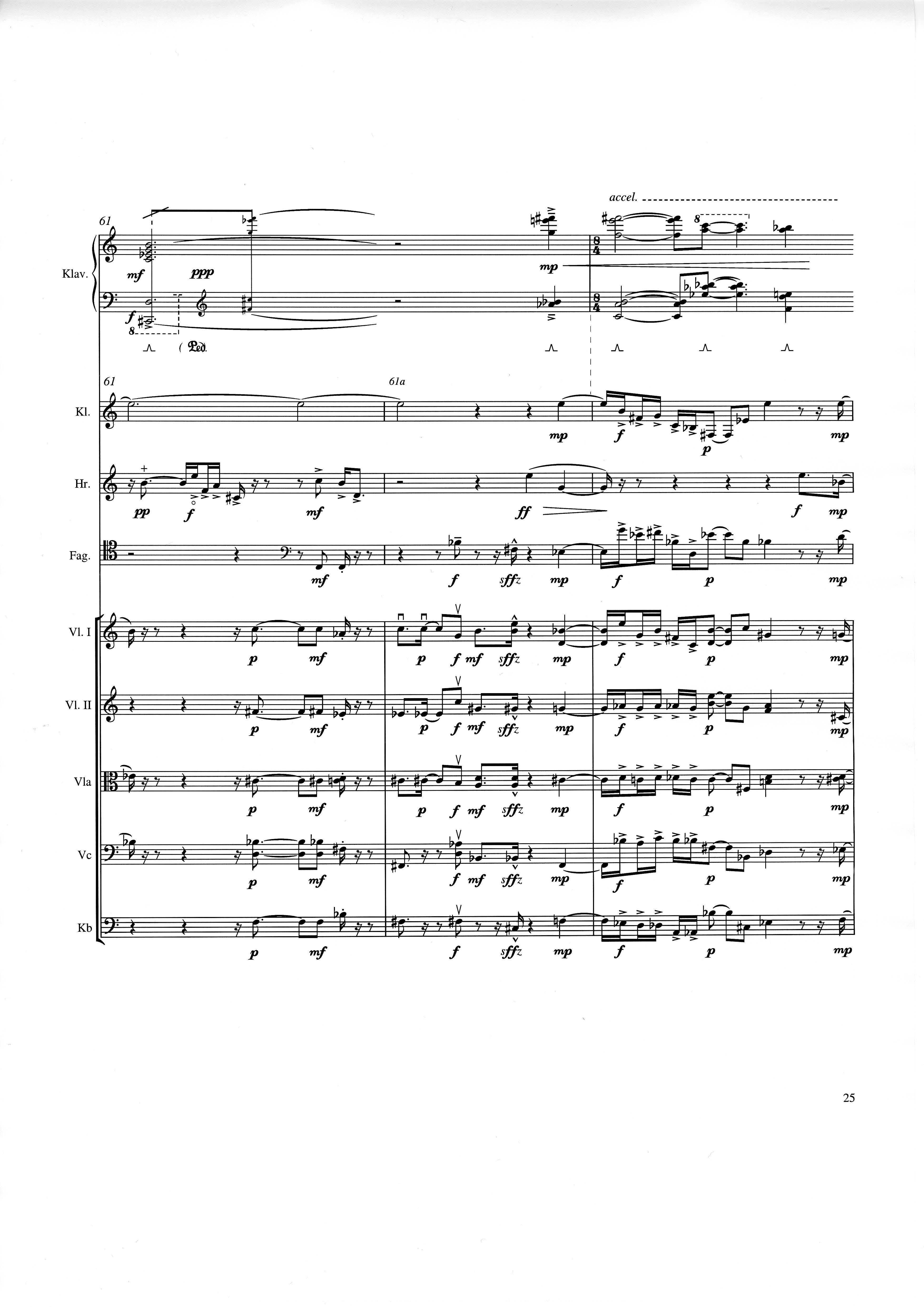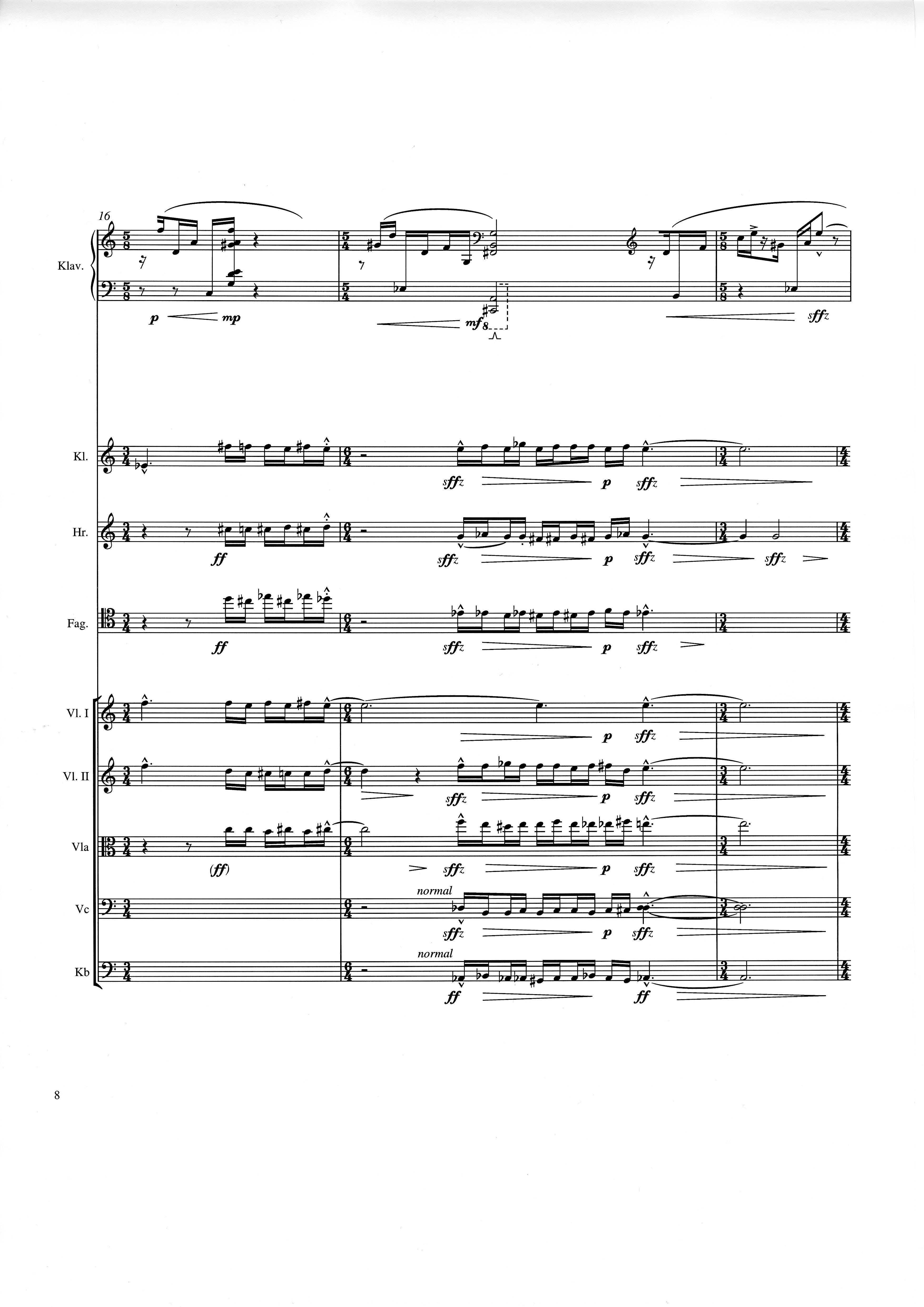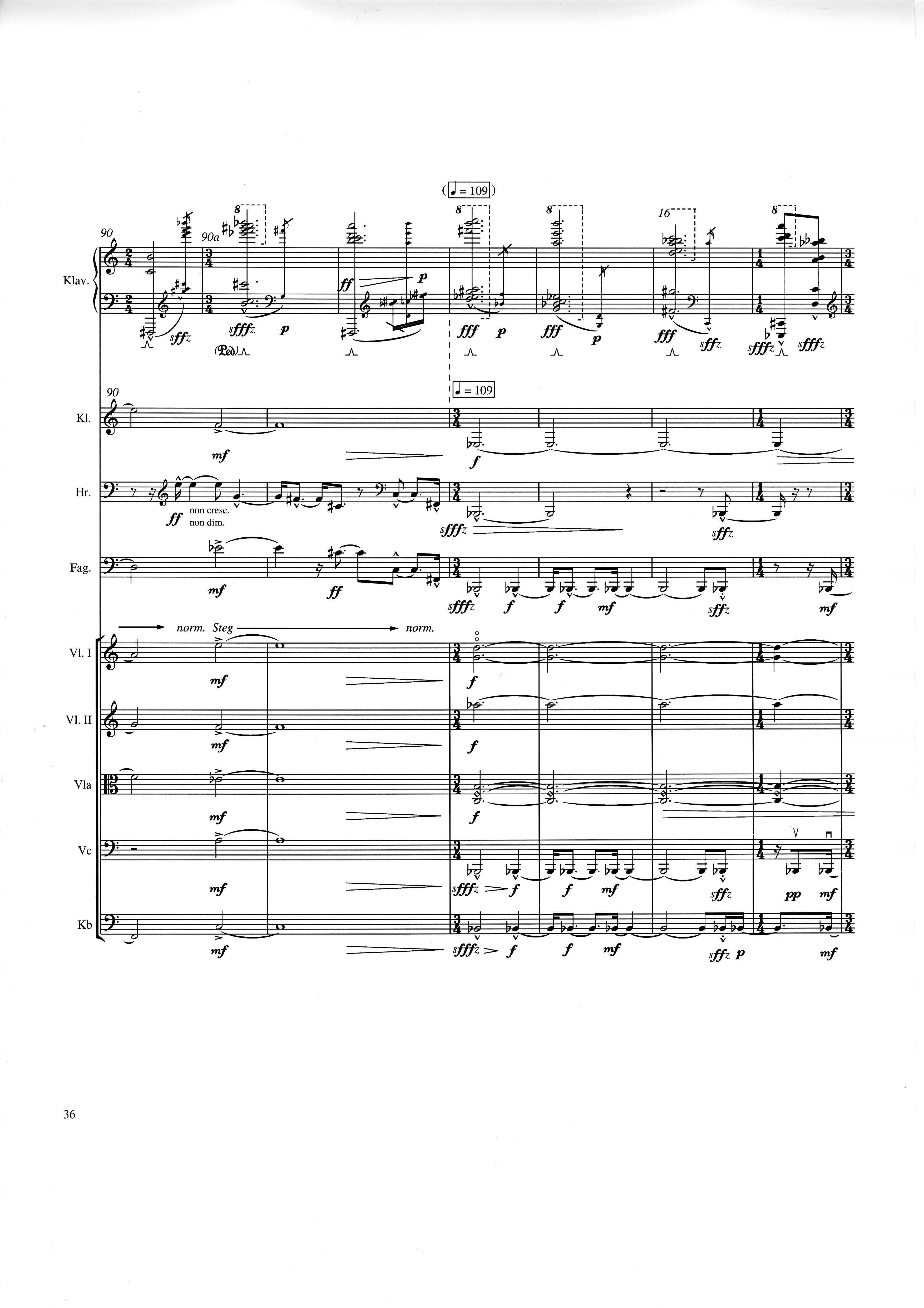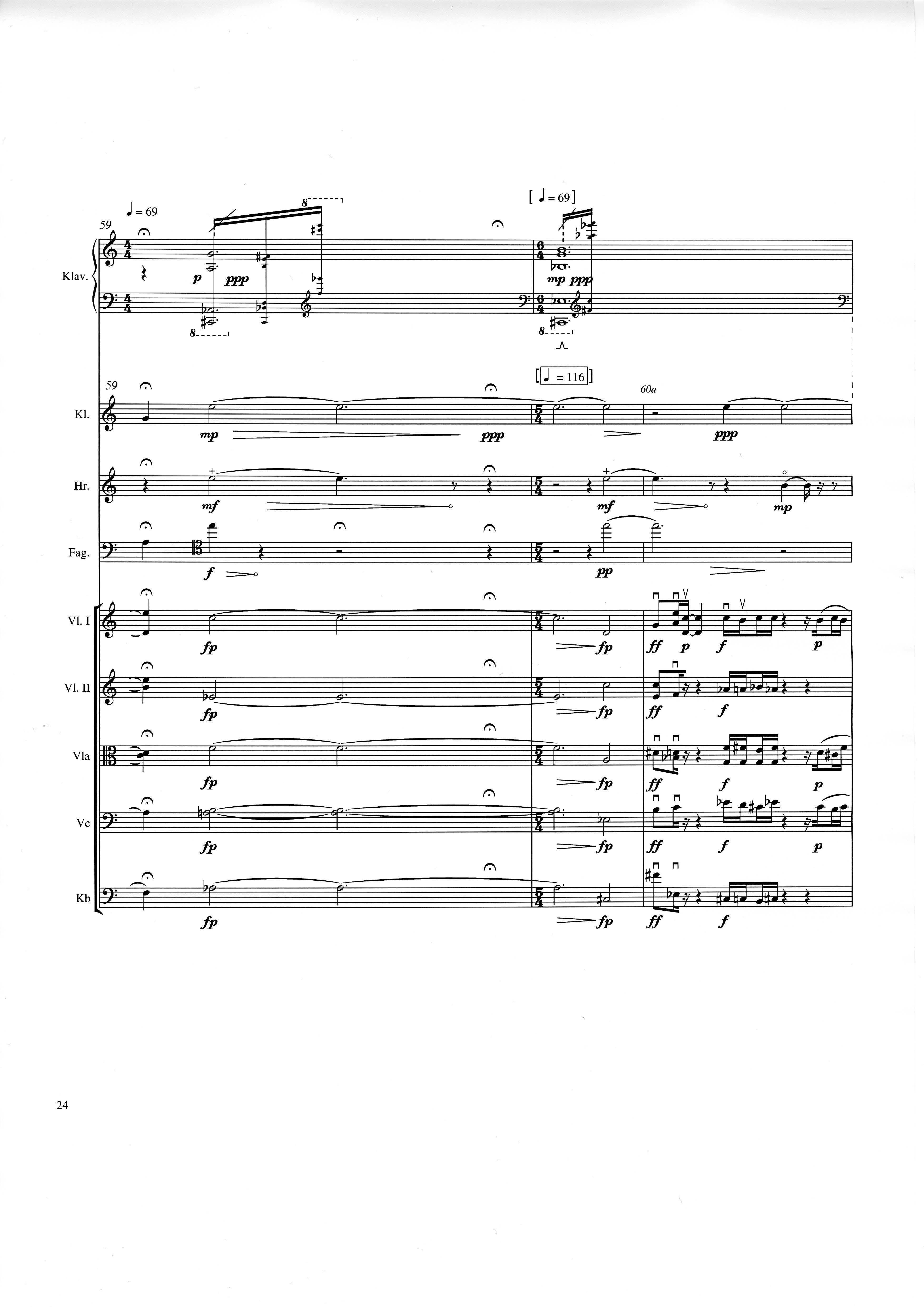 up (Klavierstück 4): Klavier solo down: Klarinette, Horn, Fagott, 2 Violinen, Viola, Violoncello, Kontrabaß strange: Klarinette (auch Baßklarinette), Harfe, Schlagzeug (Holztrommel, Große Trommel , Großes Becken) charm: shô (auch û), Violine [alternativ kann statt shô ein Akkordeon besetzt werden; die auf einem zusätzlichen System notierten Töne im Baßschlüssel]