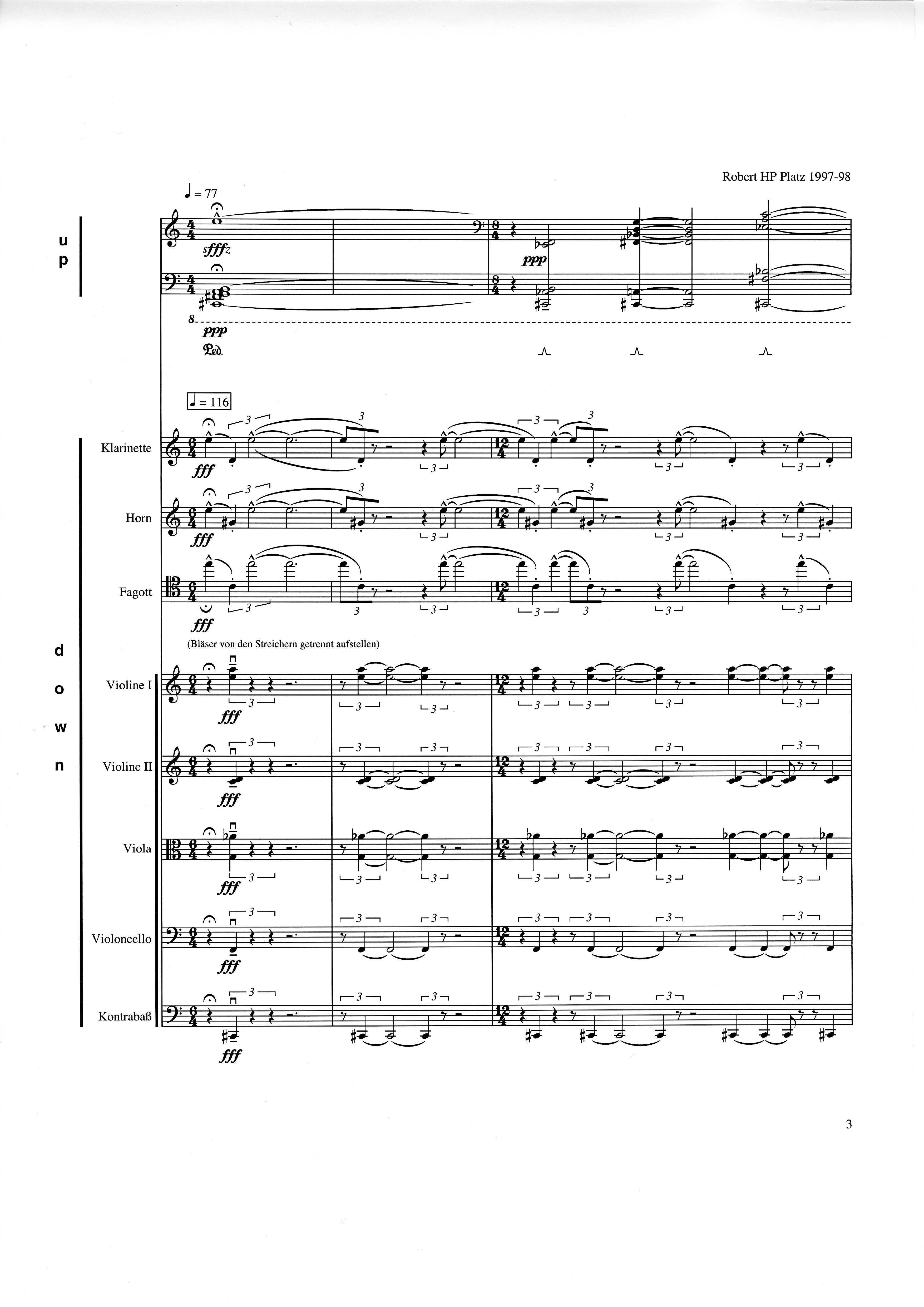 down - hinab, abnehmen, leiser werden, langsamer werden, zurücknehmen, weniger von... bruchlose und doch nicht lineare Entwicklung - Heterophonie, Poly-, Anti- und Homophonie ineinander übergehen lassen den Raum hören (Bläser weit auseinander) barocke Formenvielfalt und doch: Rigorosität der Kargheit, Reduktion auf archetypische Gestalten des Rückzugs down entstand 1996-98 im Auftrag des SCHÖMERHAUS Klosterneuburg (Karlheinz Essl) und wurde durch das Ensemble Die Reihe unter Leitung des Komponisten im Rahmen von WIEN MODERN am 14.11.98 uraufgeführt. Die Partitur ist Karlheinz Essl gewidmet.