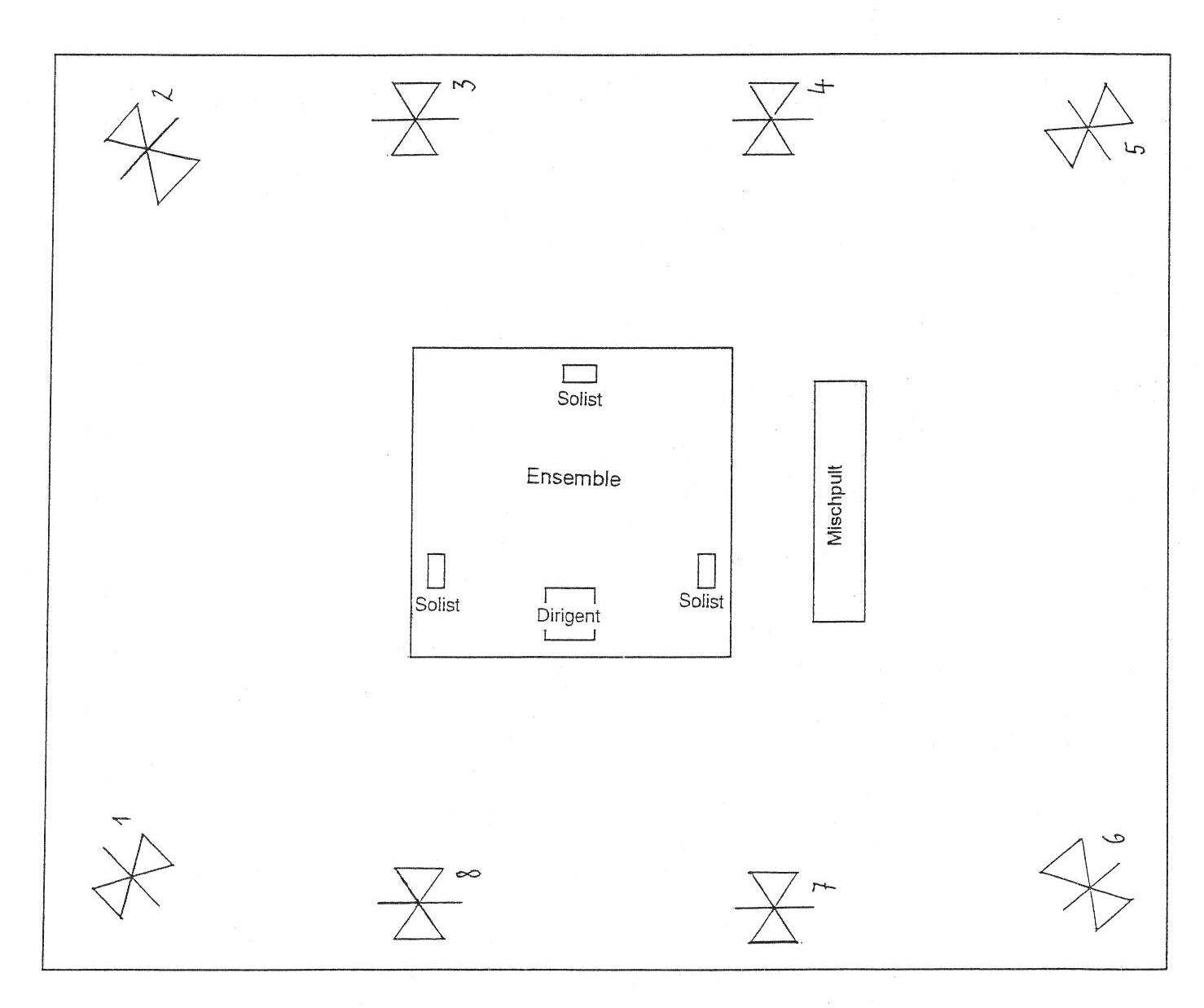 Jeder in den Saal gerichtete Lautsprecher strahlt direkt ins Zentrum des Saales ab. Die zweiten Lautsprecher mögen diffuses Signal abliefern und deshalb nach oben an die Decke gerichtet werden.