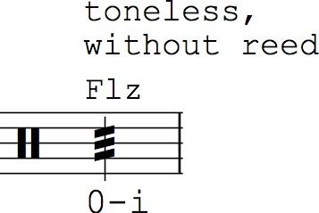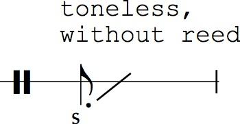 = double harmonics = glissando on a very high note played "à la tromba" = without reed, perform a flutter-tongue articulating o-i formants into the air stream = without reed, articulate "s" into the air stream while performing a glissando from dark formants to light formants