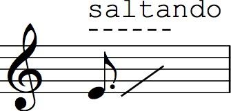= play saltando while performing a glissando with the left hand = white noise created through bowing very close to the bridge on given strings. The fingers of the left hand damp the strings very high on the string so they almost touch the bow.