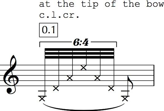 = let the bow rest on the strings, at the tip of the bow, and perform an arpeggio with almost now bow speed. A soft metallic sound occurs. = dynamics in quotation marks refer to the intensity of a performance technique, not the actual loudness This gesture is primarily choreographic and should be performed with of the resulting sound an exaggerated arm movement.