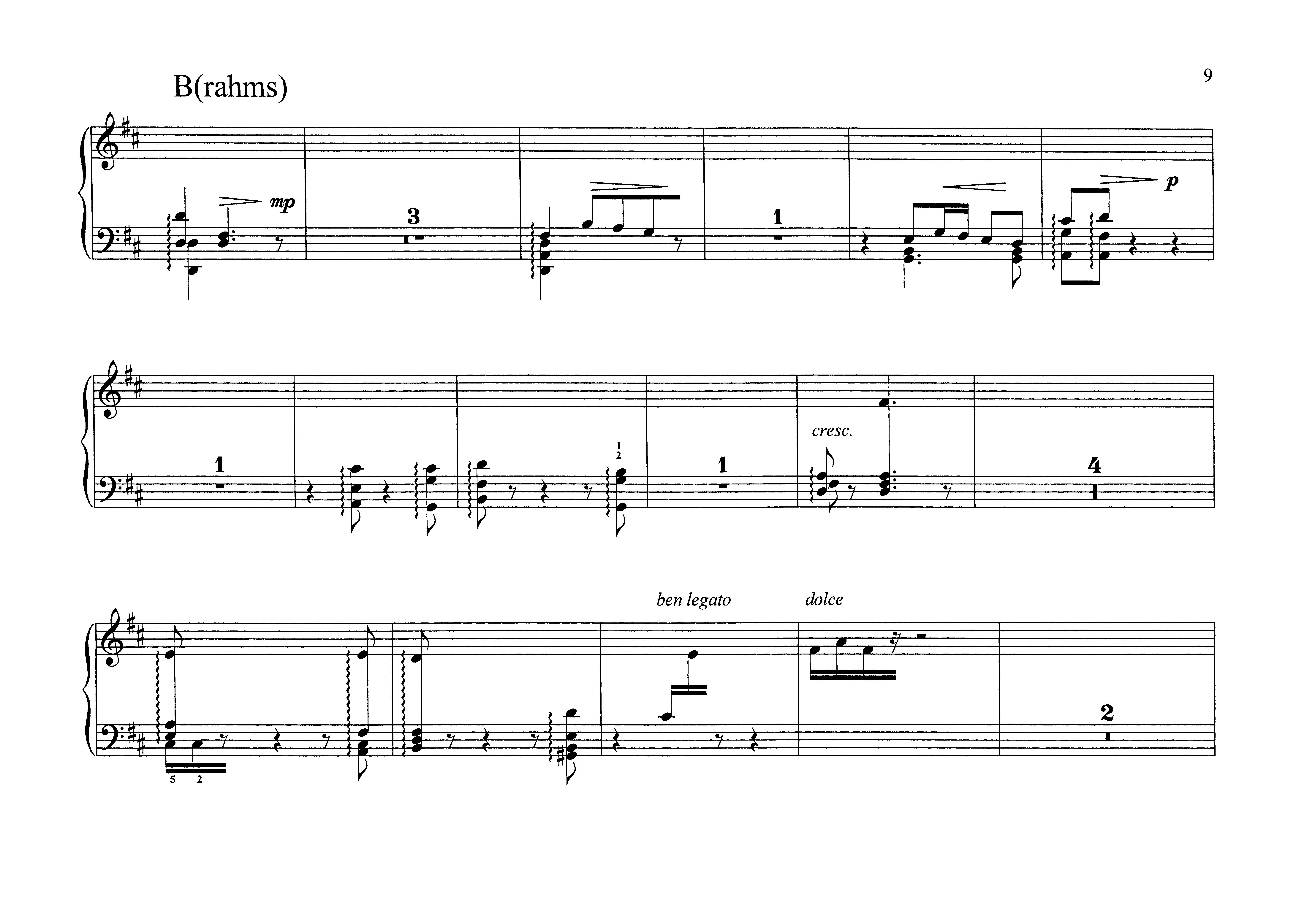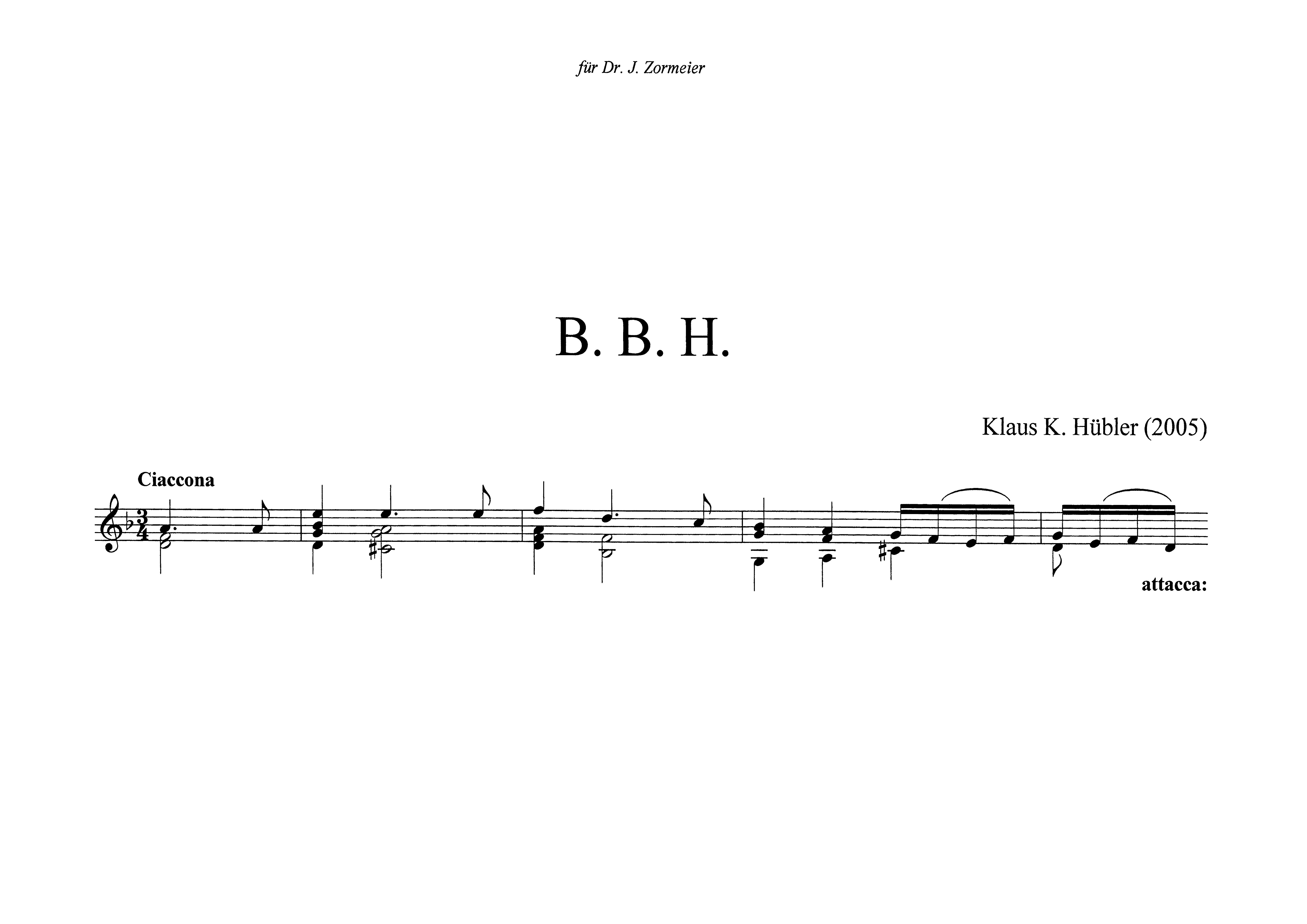 Die Initialen B. B. H. stehen für Bach, Brahms und Hübler. Der dreiteiligen Komposition steht das Kopfmotiv der berühmten "Ciaccona" in d-moll als Motto vor. Zunächst wird unter der Lupe eines Johann Sebastian Bach linkshändig dieses Thema "verarbeitet" und nach vier Kadenzen mit einem Ernst-Jandl-Fragment schließlich "abkadenziert". Dann folgt gleichfalls linkshändig unter der Brahms'schen Direktive eine weitere Variante, die in das links- und rechtshändige und phasenweise auf neun Systemen sich spreizende und notierte Finale einmündet, ein Finale, das Klaus K. Hübler mit dem eigenen Namen überschreibt.
