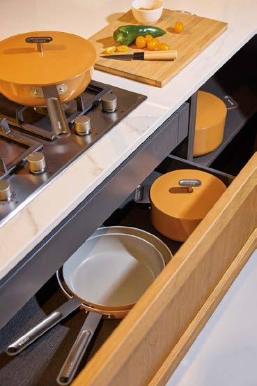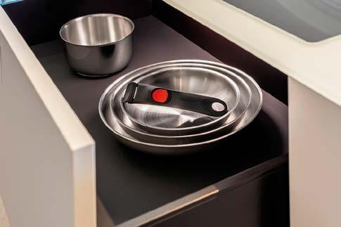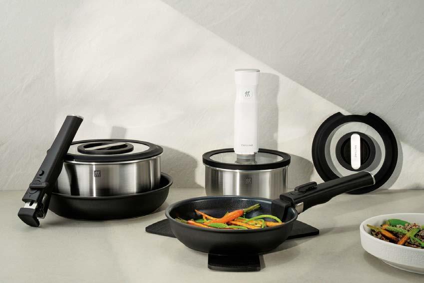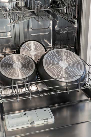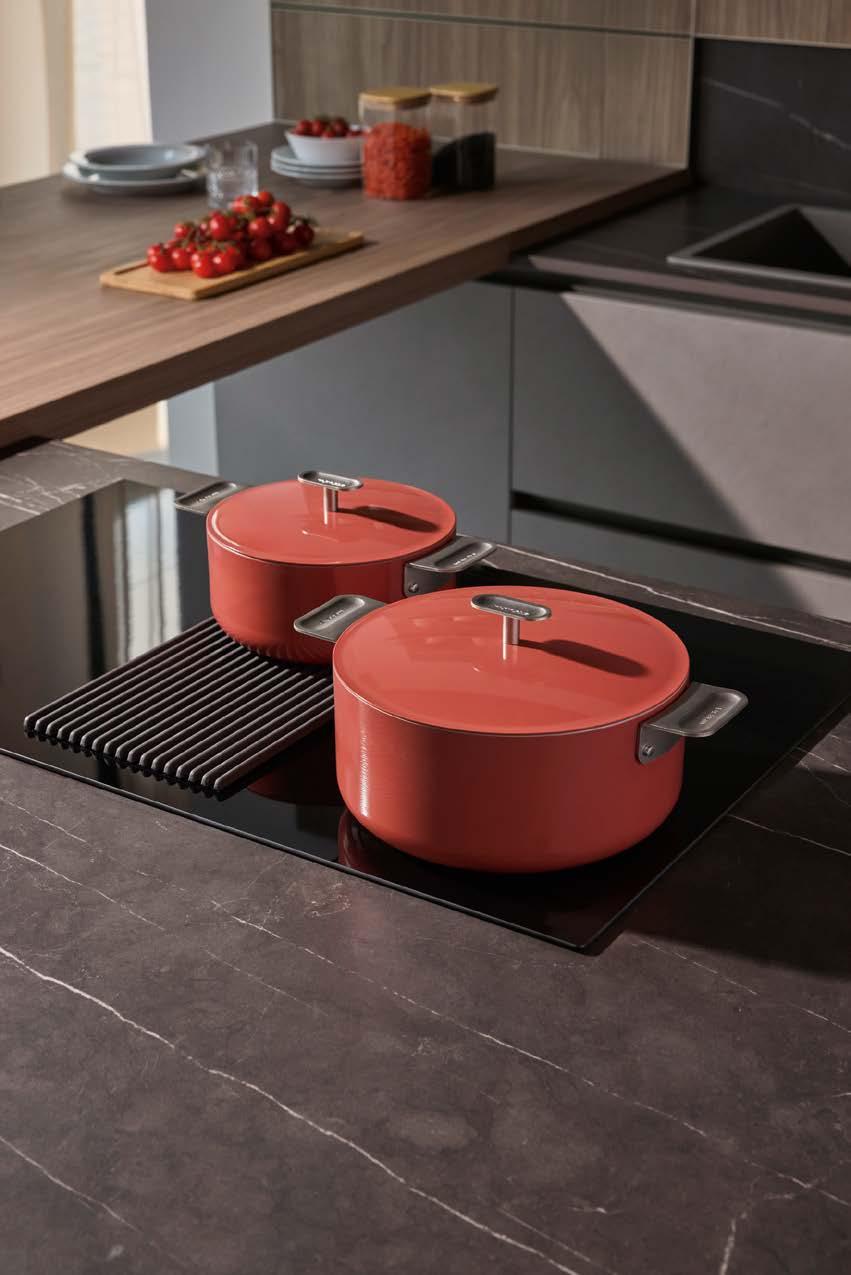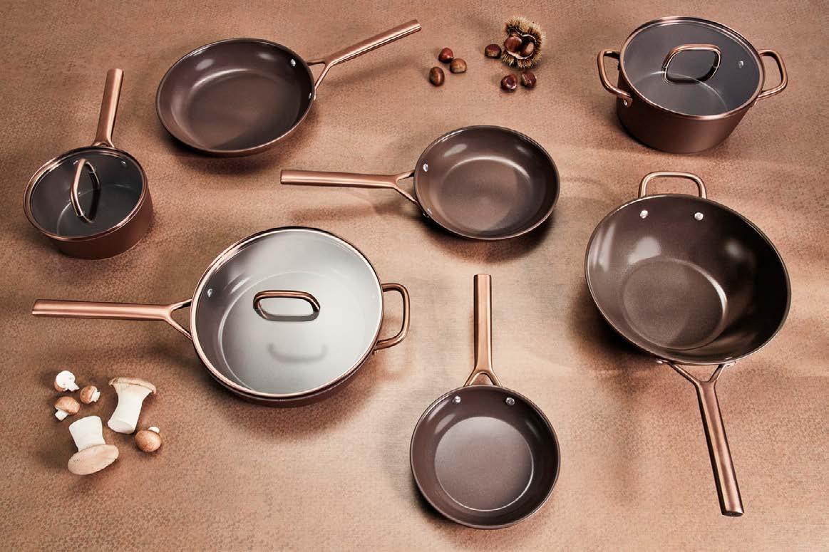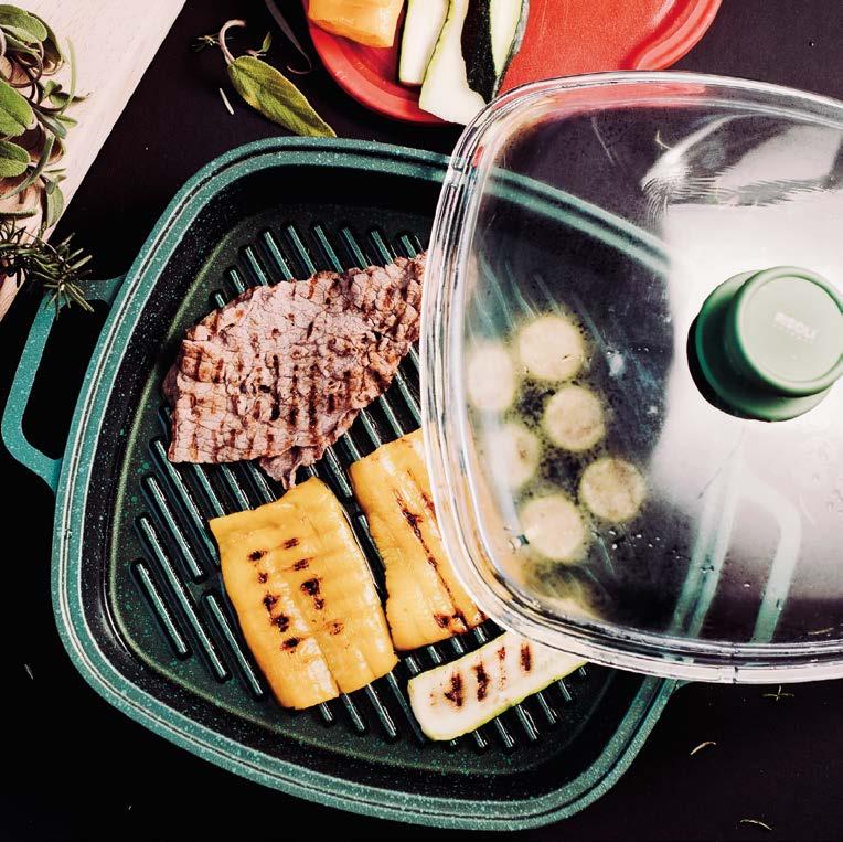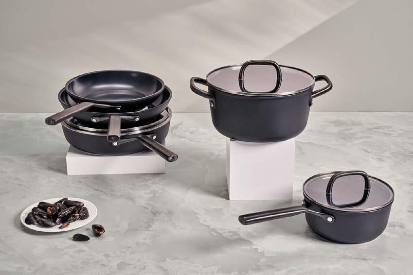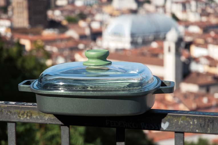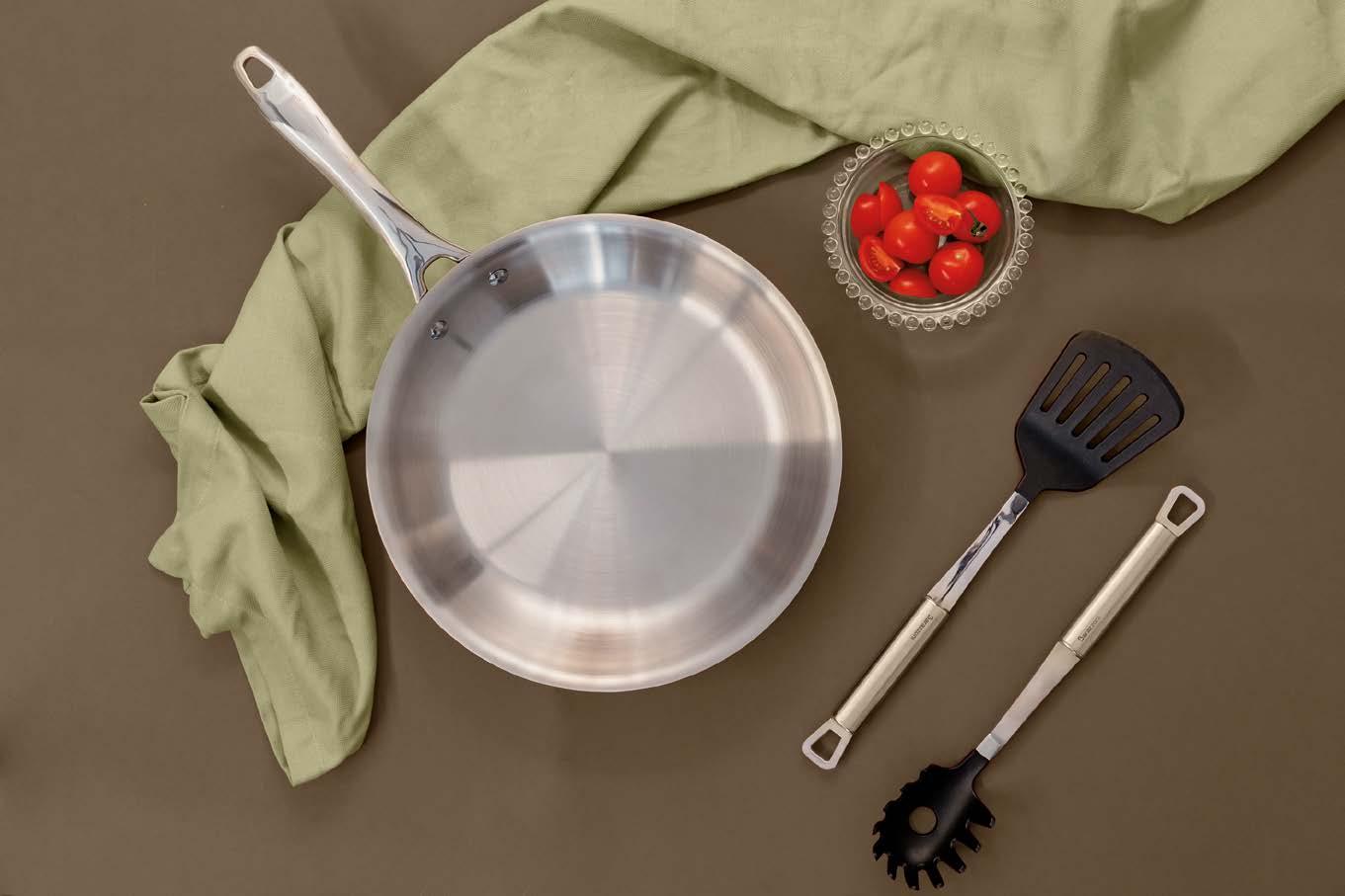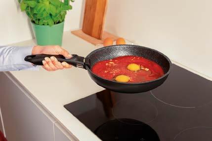 scalda il 65% più velocemente rispetto ad altre fonti di calore e consente un risparmio energetico del 37%, dati che si traducono in argomenti concreti per chi opera nel punto vendita e deve accompagnare il cliente in una scelta consapevole. Il rivestimento esterno con spessore maggiorato completa il pro lo tecnico del prodotto, garantendo una maggiore robustezza complessiva e una gestione più ef ciente del calore dall’esterno verso l’interno. La possibilità di utilizzare le padelle e le casseruole in forno senza il manico, e di lavarle in lavastoviglie con la stessa facilità, eleva ulteriormente la praticità d’uso. I coperchi in vetro temperato, acquistabili a parte, permettono di monitorare la cottura preservando calore e umidità all’interno.