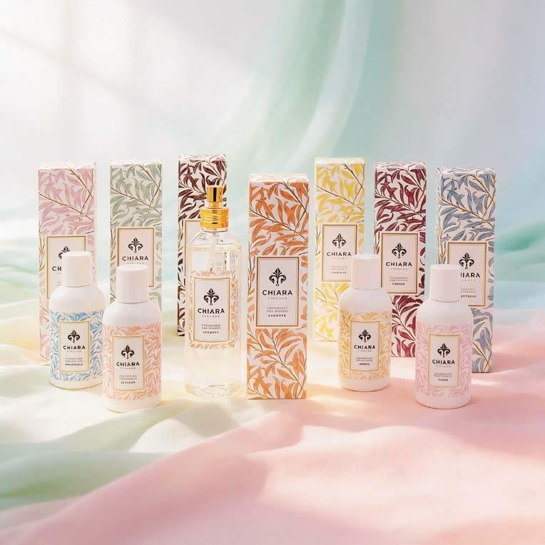 Biancheria, tendaggi e tessuti si lasciano attraversare da una fragranza sottile, che evoca immediatamente una sensazione di pulito e di cura. Le profumazioni firmate Chiara Firenze si legano alle fibre con discrezione, rilasciando nel tempo note persistenti e avvolgenti. Gli spray per tessuti, in formato da 250 ml, in 14 fragranze, si affiancano ai profumi per bucato da 150 ml in 9 varianti.