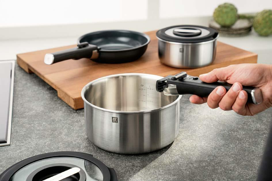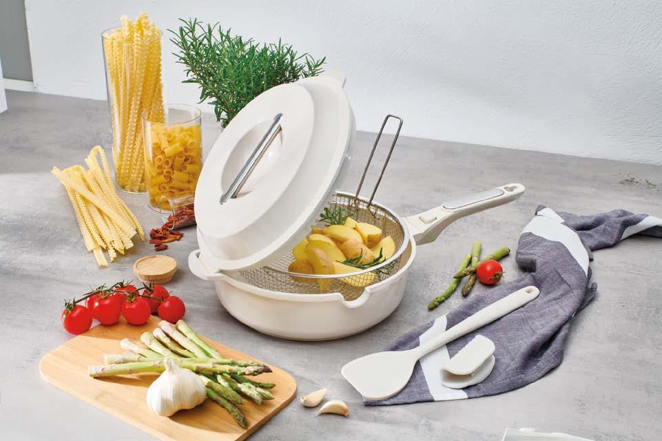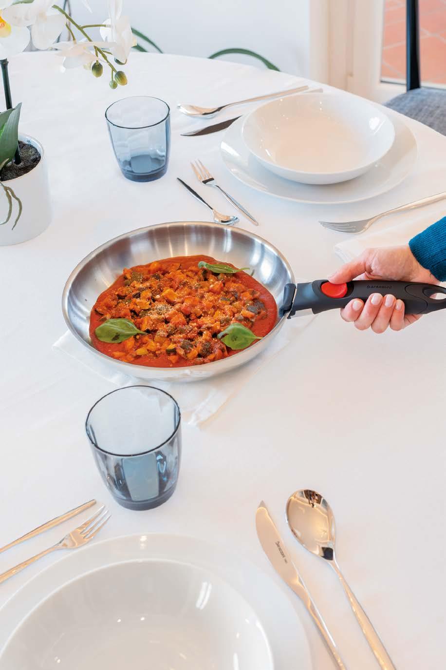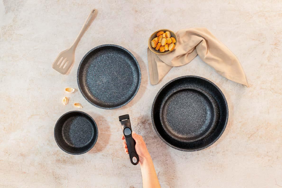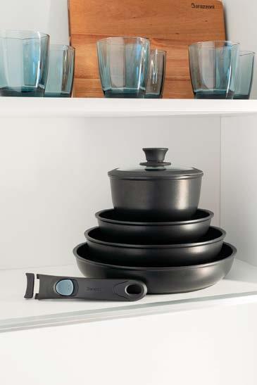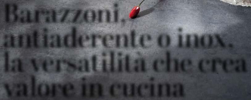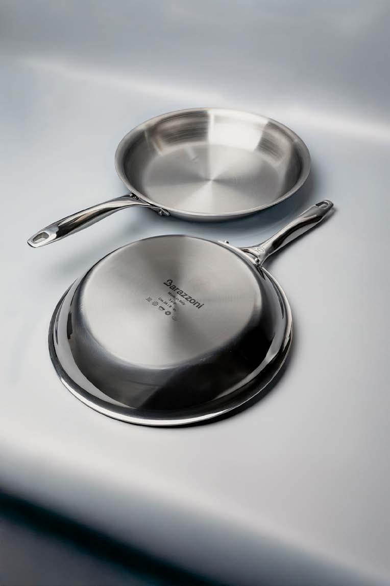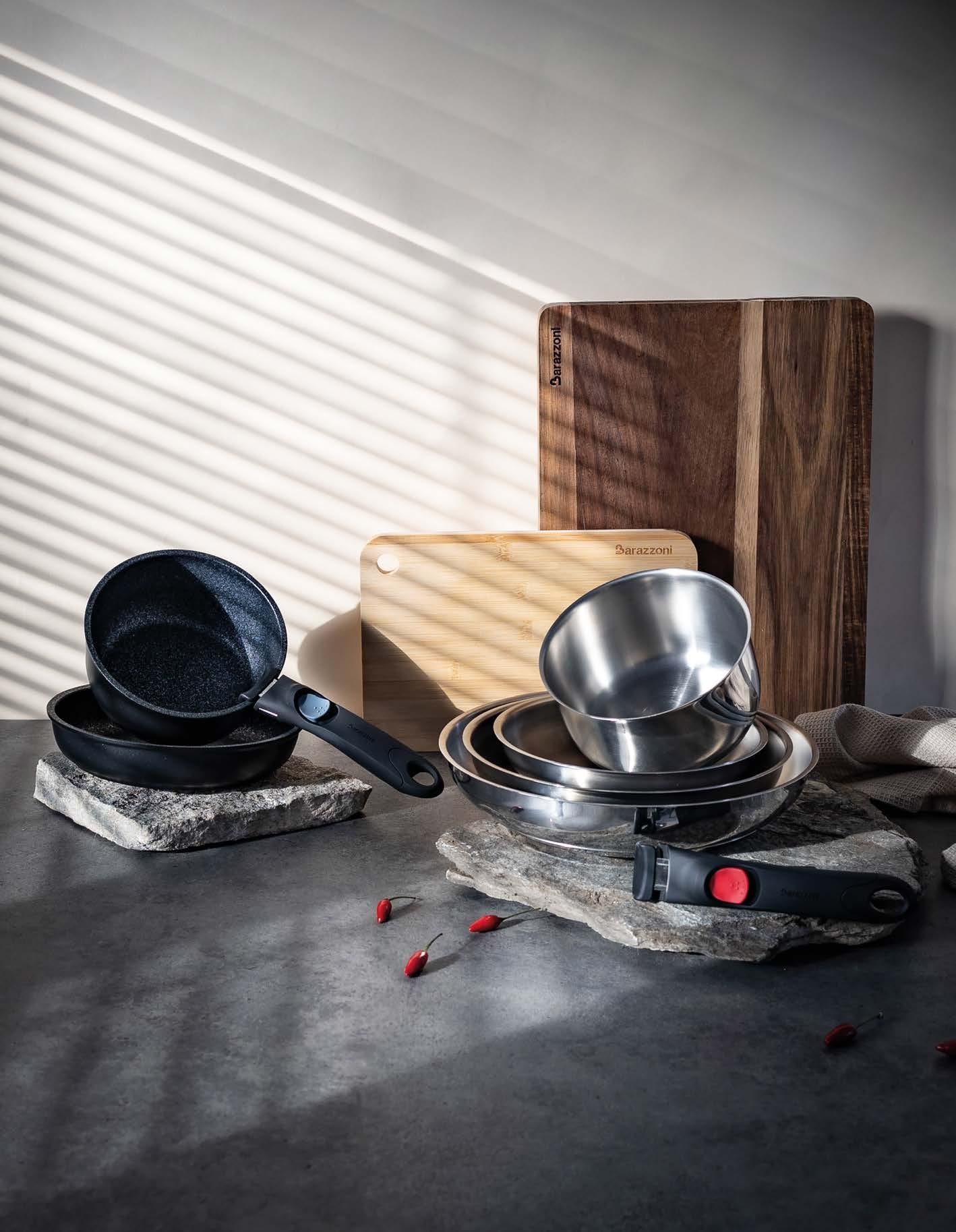 Manico staccabile: paradigma di modernità L’evoluzione del mercato cookware italiano passa sempre più attraverso l’innovazione funzionale. Barazzoni, storica azienda del settore con radici profonde nella tradizione manifatturiera nazionale, ha scelto di rispondere a questa s da innovando due linee di prodotto che condividono la stessa loso a progettuale: un manico staccabile ergonomico, realizzato in bakelite, che consente di trasformare ogni singolo corpo pentola o padella in uno strumento polivalente. Il concept “Un solo manico per tutte”, infatti, non è una semplice trovata commerciale: risponde a un’esigenza reale e documentata del consumatore moderno, che cerca soluzioni intelligenti senza rinunciare alla qualità e apprezza la possibilità di portare la padella dal fornello o dal forno alla tavola, no al frigorifero, ampliandone in modo concreto le funzioni d’uso quotidiane. Per i negozianti e i buyer del settore casalinghi, si tratta di un argomento di vendita diretto, immediato, comprensibile a chiunque: più versatilità nell’utilizzo quotidiano e meno ingombro in cassetto e in armadio, una risposta ef cace per chi vive in abitazioni sempre più compatte e dispone di spazi ridotti in cucina.