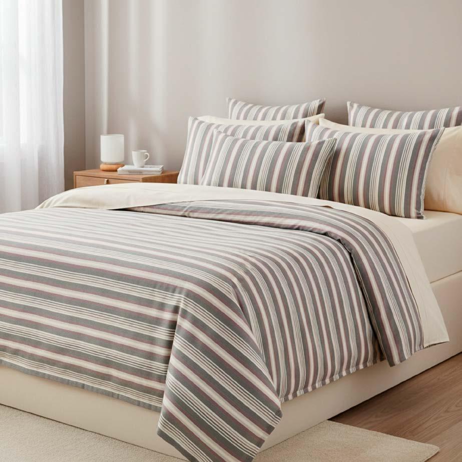 Effetto dipinto a mano per la coperta in lino di Once Milano, caratterizzata da strisce cabana sfumate che spaziano dal marrone caffè al ciliegia scuro fino alle tonalità fresche del matcha. L’imbottitura in poliestere è perfetta per la mezza stagione, mentre la stampa si presta ad accostamenti diversi, tono su tono o con le altre nuance della collezione.