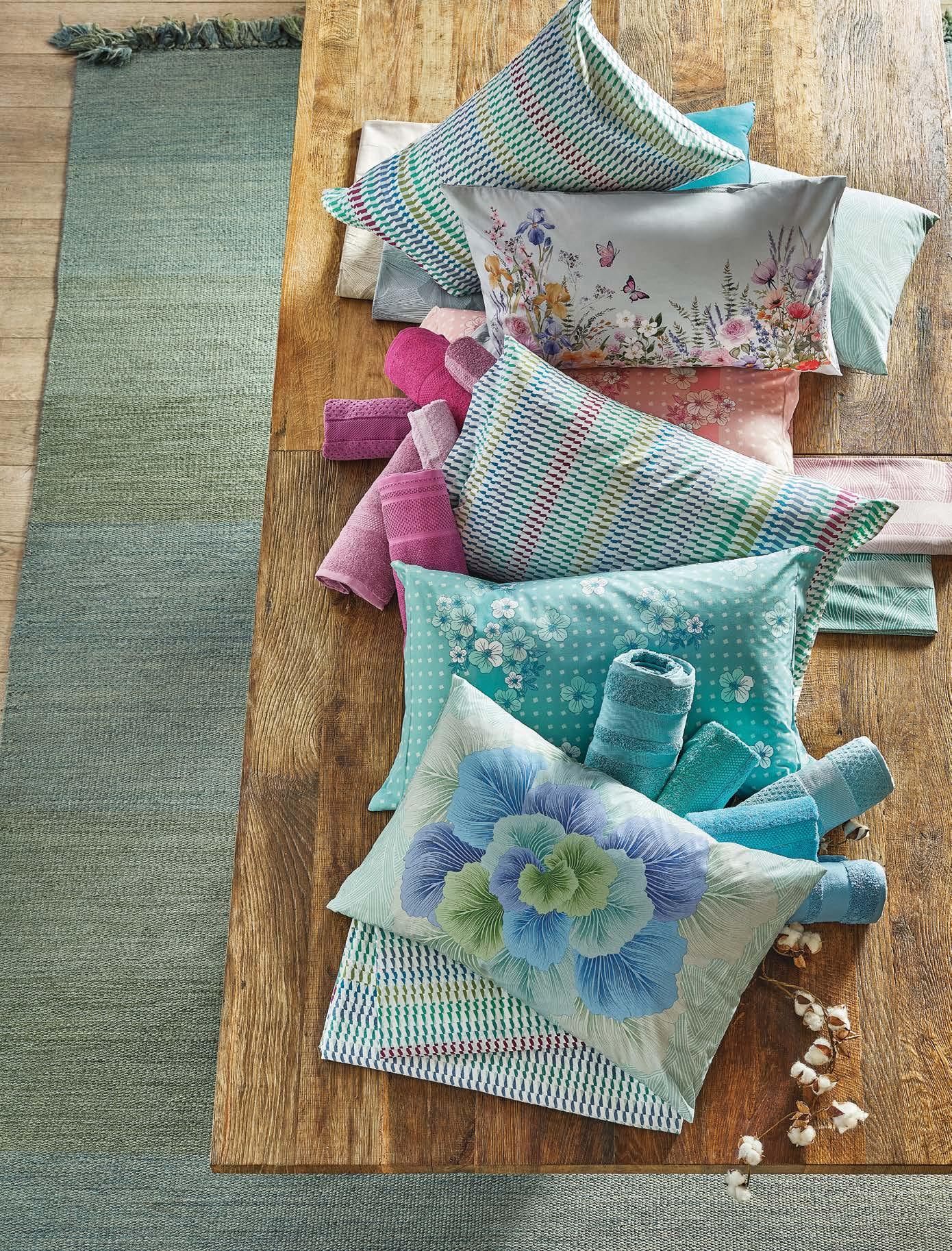La collezione P/E 2026 di Cassera punta su colori vitaminici e tessuti freschi e pregiati. Come la parure Sucre, in percalle di cotone impreziosito da una delicata stampa floreale su fondo bianco. Il motivo tinto in filo, nei toni dei frutti di bosco, illumina la stanza e disegna l’atmosfera con un’eleganza discreta e contemporanea.