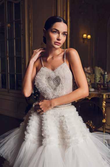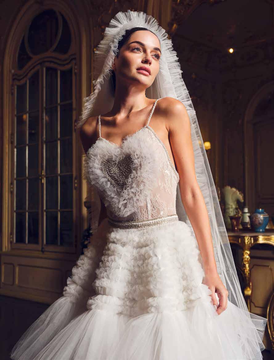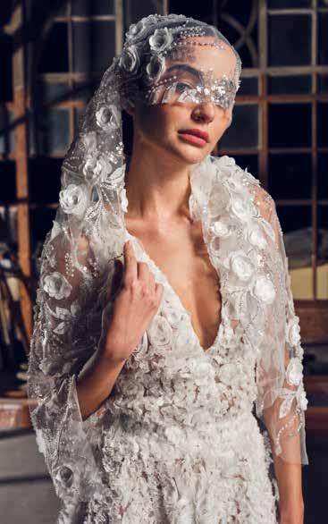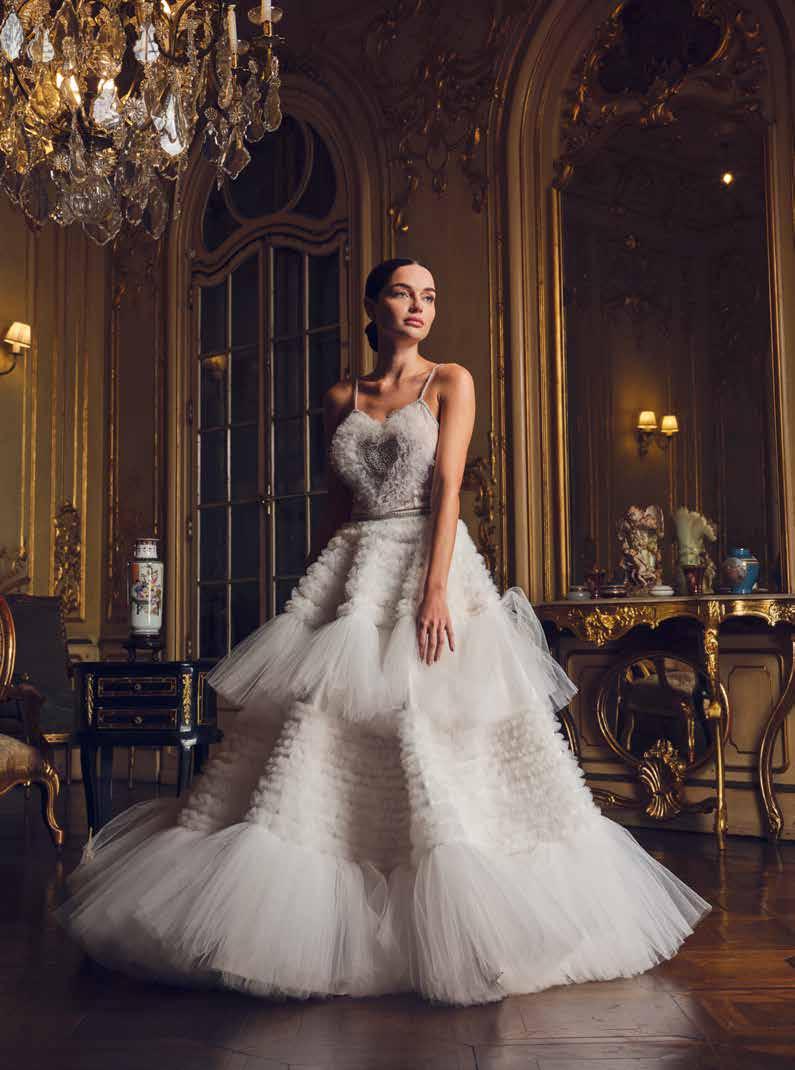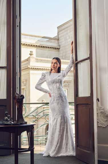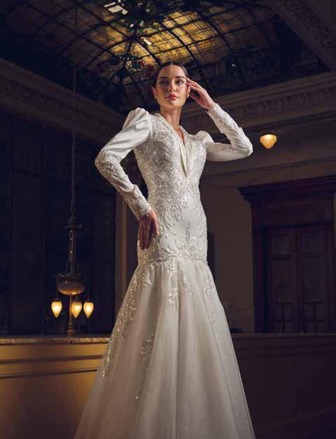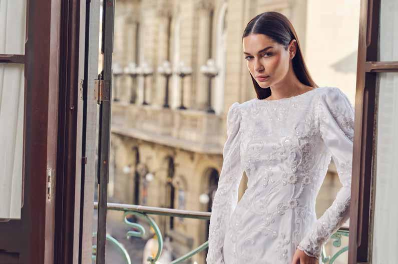 En su taller, materiales de alta gama —sedas naturales, mikado italiano, chantilly francés, brocados, guipurbordado, pedrería personalizada con símbolos o frases significativas, así como tules y organzas premium entre otros— se transforman en piezas que celebran la elegancia en su forma más pura y silenciosa.