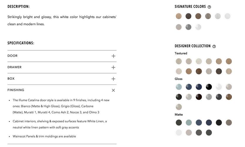 The Illume Catalina door style is available in 9 finishes, including Matte & High Gloss Cabinet interiors, shelving & exposed surfaces feature White Linen, a neutral white linen pattern with soft gray accents