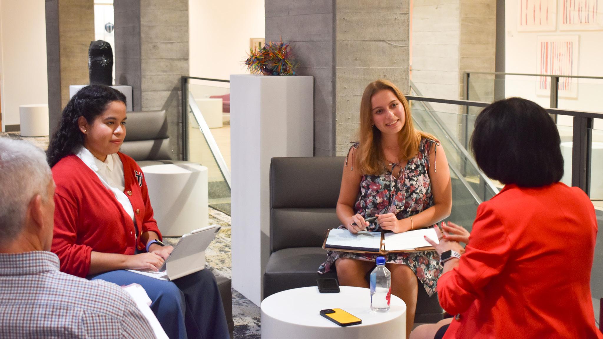 Photo Courtesy of Mariam Bernardini-Herrera Aimee Kanaskie and Franchesca Murrugarra interviewing President Dahlberg