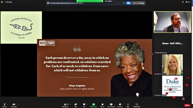 In this year's faculty plenary, Dr. Shyni Varghese, a faculty member who holds appointments in both the School of Engineering and the Department of Orthopedics in the School of Medicine, shared her fascinating work focused on developing products that help with many common medical issues. Dr. Brian Sexton, Director of Duke Center for Healthcare Safety and Quality, was the afternoon keynote speaker and shared specific tools and approaches that individuals can employ to prevent burnout and improve their well-being. For the remainder of the day, participants could choose from various concurrent session topics ranging from an S4 Update to effort management best practices to discuss using tools in MyRESEARCHhome to better manage industrysponsored research. For more details or to review recordings of sessions, visit the symposium website.