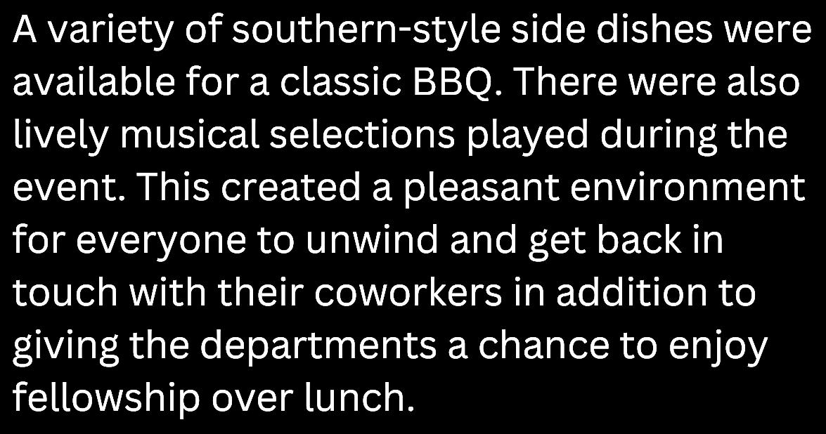 Melodieprovidedinformationand picturesontheCorporatePayroll, AccountsPayable,andEmployee Travel&Reimbursementstaff potluck Aswellaspicturesanda writeupabouttheControllers’ LeadershipTeamRetreat.