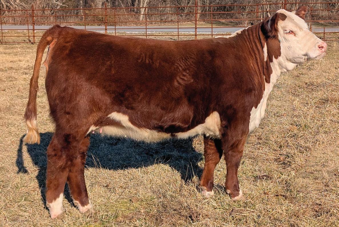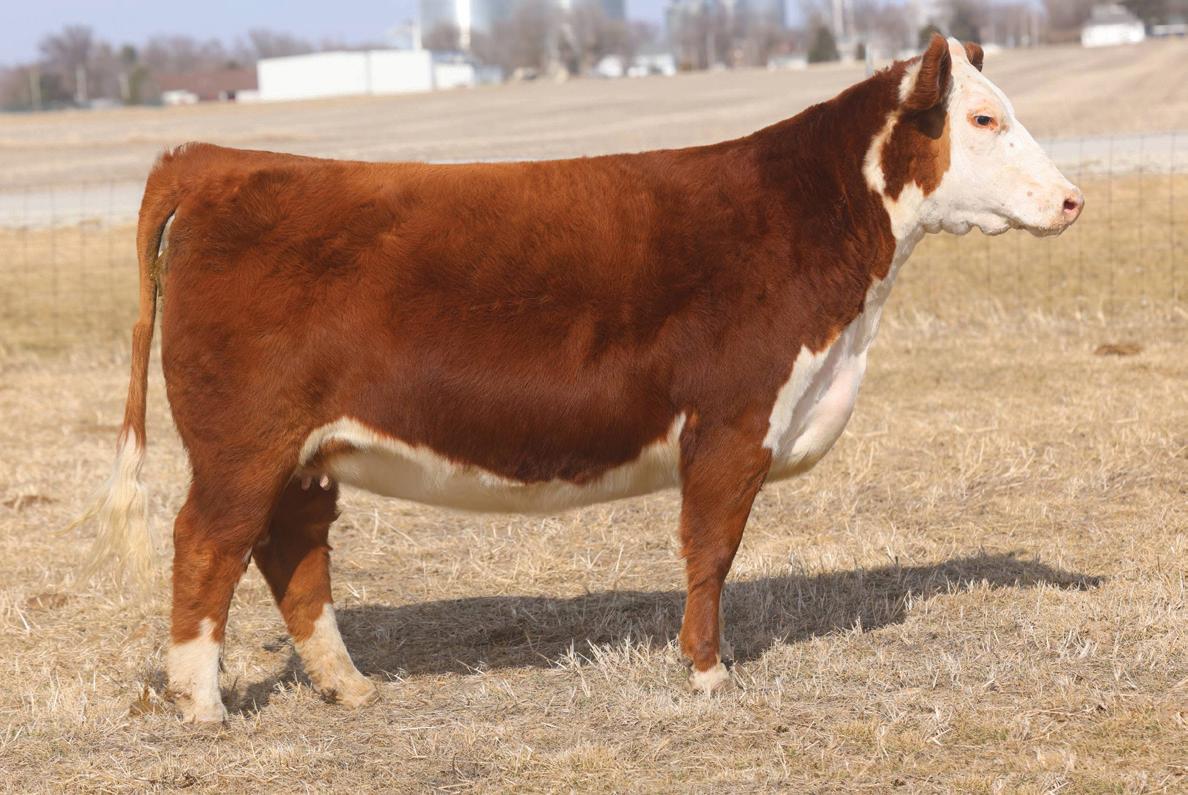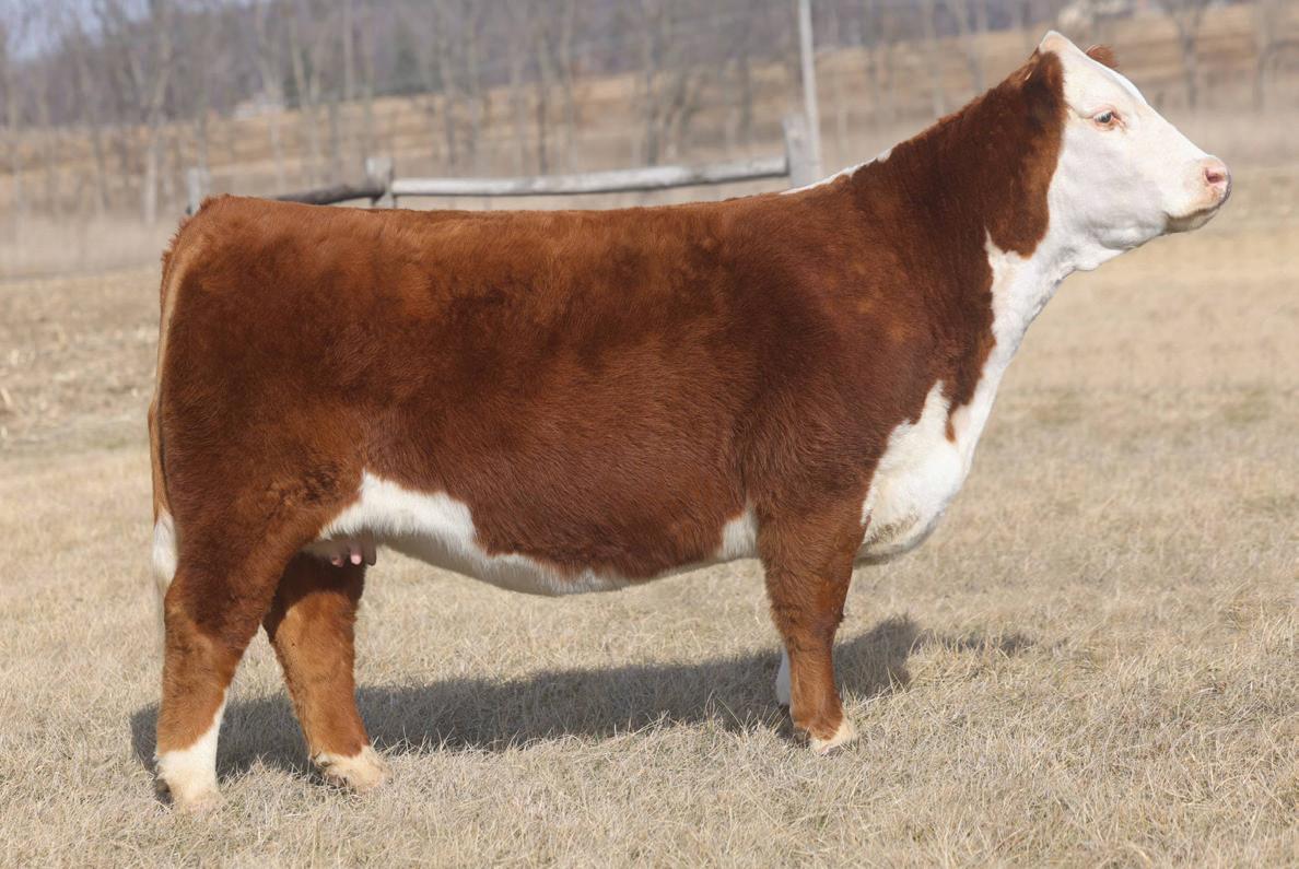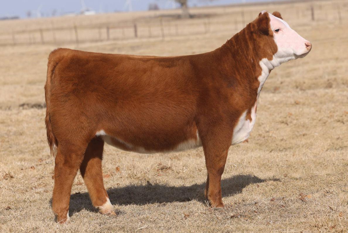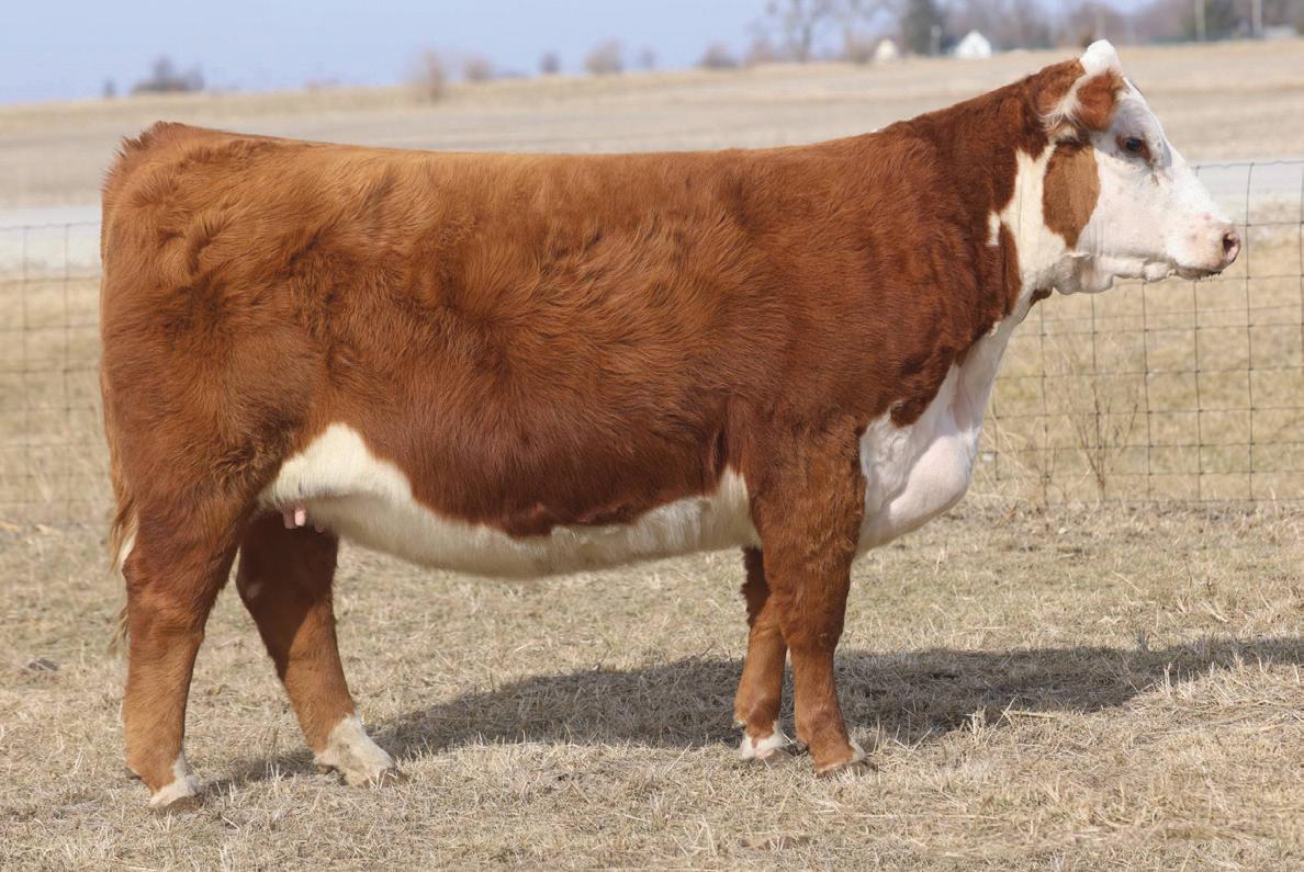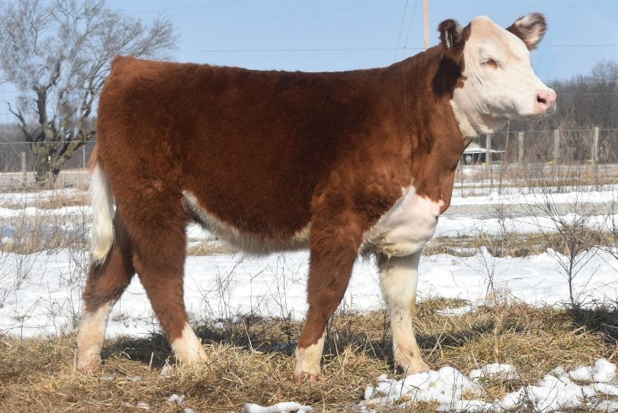 Phoenix comes from the most proven cow family in our herd that provides functionality with extra power and eye appeal. Phoenix is as stout made as they come, has huge foot and bone, with length of body tied into a moderate, attractive package. Her first calf is a steer that is out on the Indiana Show Circuit, and she herself is a former Reserve Champion Bred and Owned Heifer at the Illinois State Fair. Consigned by Benedict Herefords, Noah Benedict, 217-372-8009, 605 CR 2300 N, Dewey, IL. 61840.