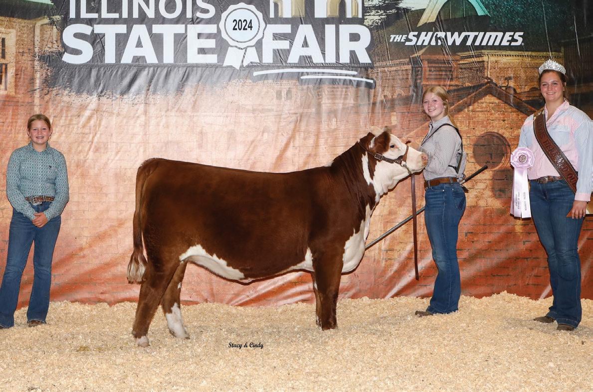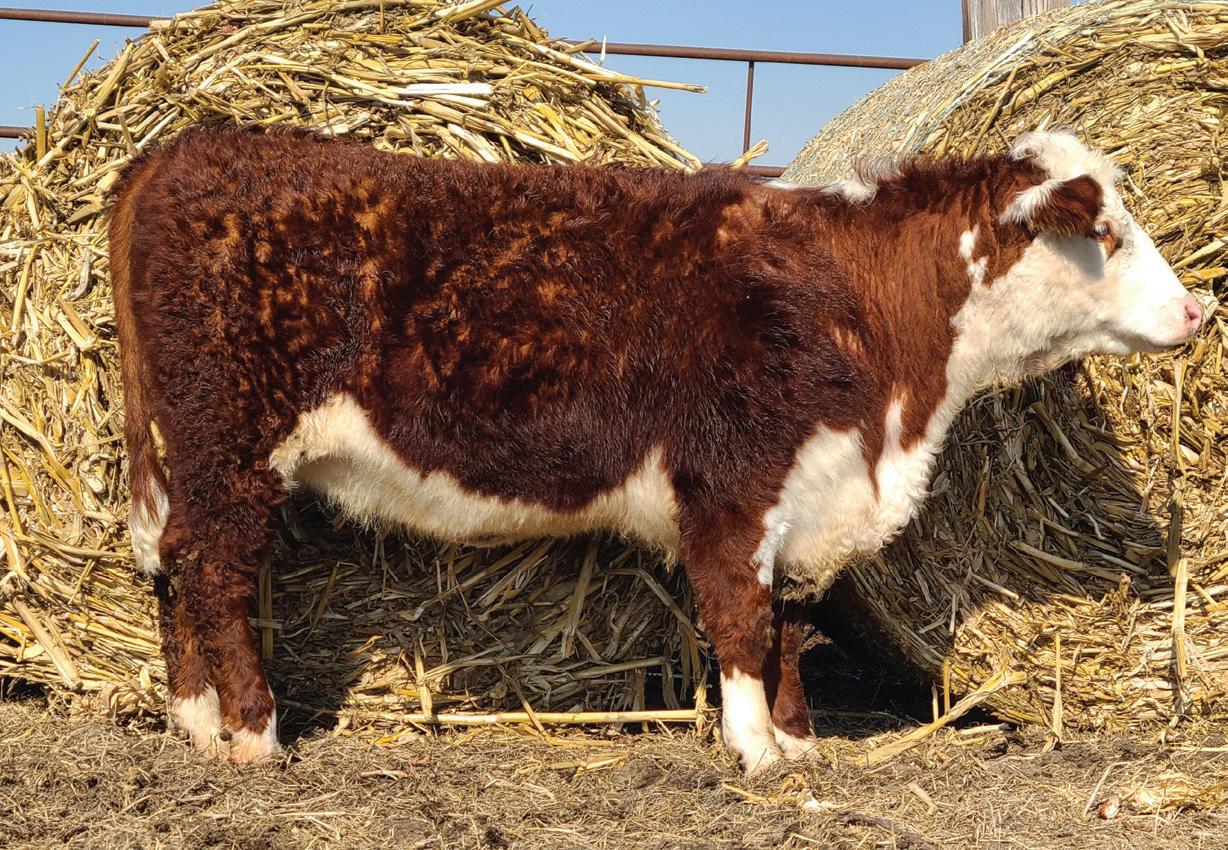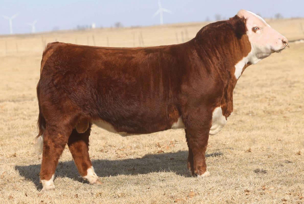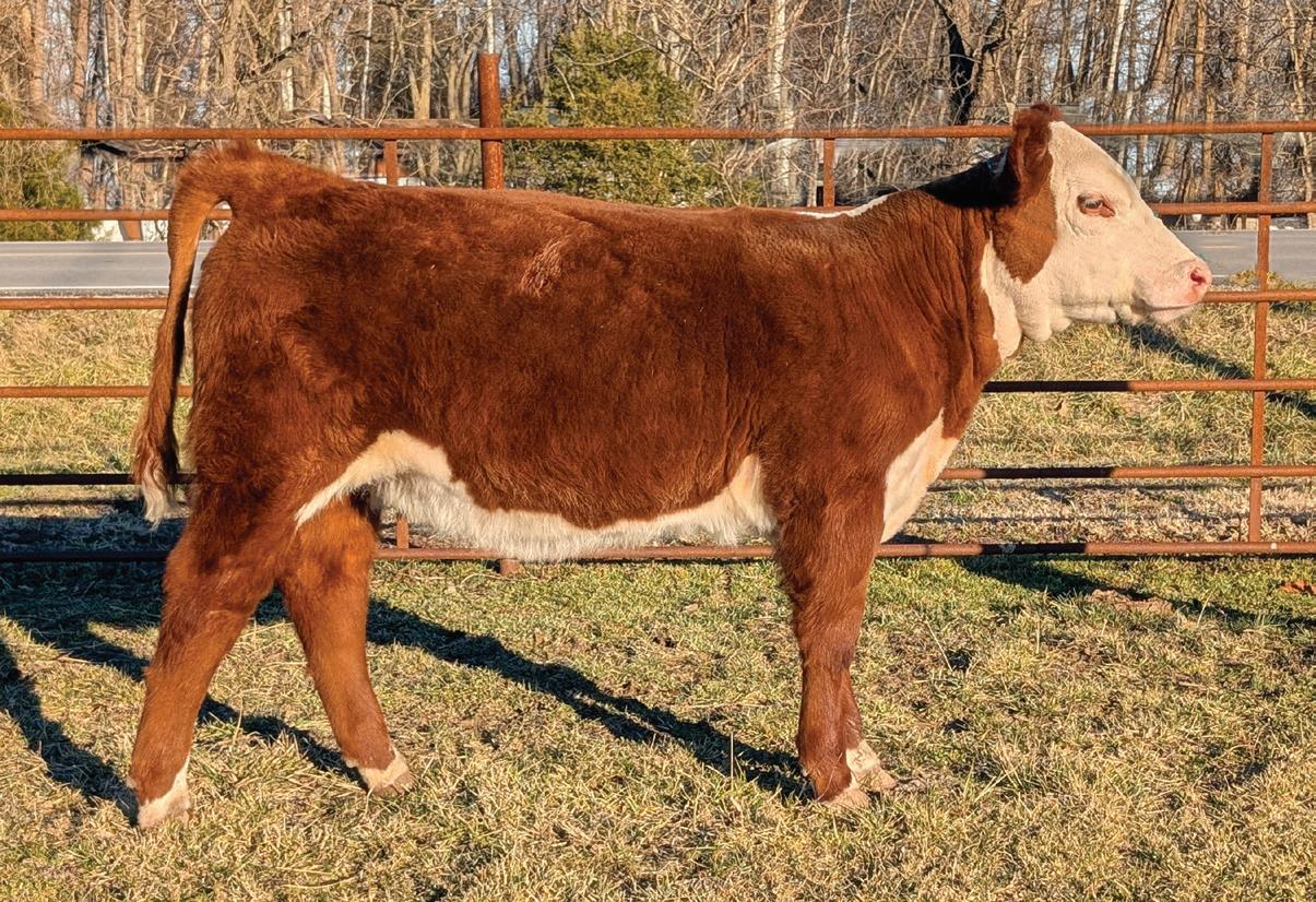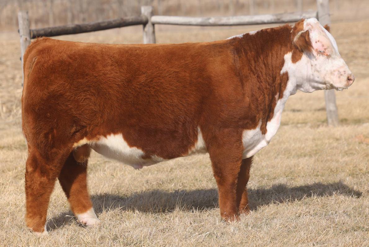 Phoenix comes from the most proven cow family in our herd that provides functionality with extra power and eye appeal. Phoenix is as stout made as they come, has huge foot and bone, with length of body tied into a moderate, attractive package. Her first calf is a steer that is out on the Indiana Show Circuit, and she herself is a former Reserve Champion Bred and Owned Heifer at the Illinois State Fair. Consigned by Benedict Herefords, Noah Benedict, 217-372-8009, 605 CR 2300 N, Dewey, IL. 61840.