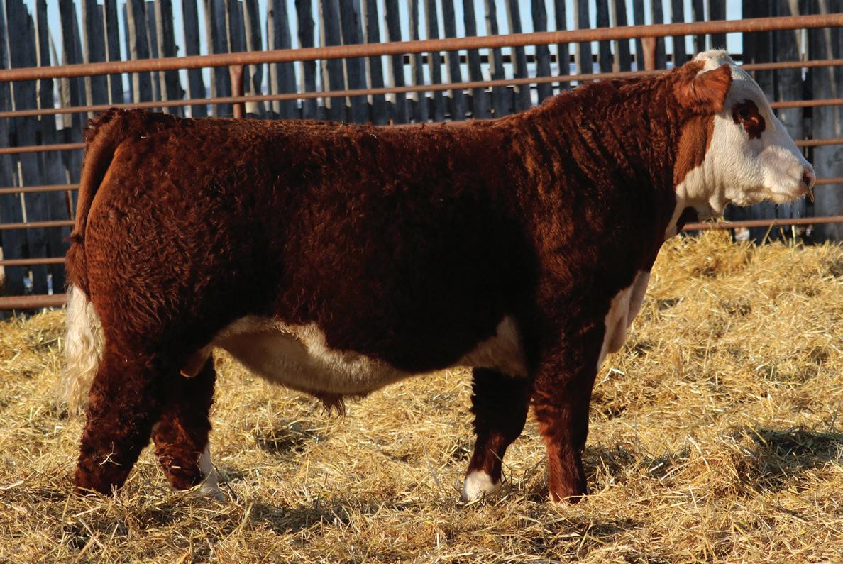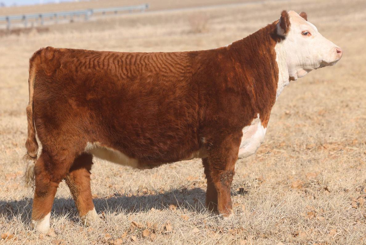 This first calf heifer is very unique. She is a full sister to 1502. A cow that has done a fantastic job for us and Perks Ranch. She is a more moderate version with an excellent udder. When you see her On Demand heifer calf at side it’s obvious the genetics are there! I think her heifer calf is really special. Consigned by Kline Herefords, Randy Kline, 309-824-9937, 113 South Hemlock Street, LeRoy, IL 61752.