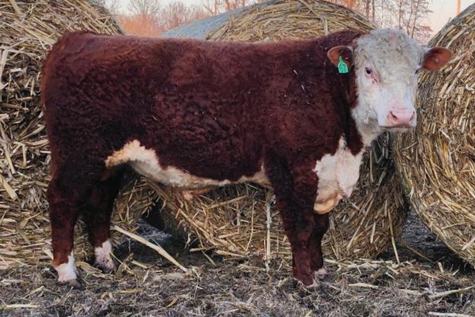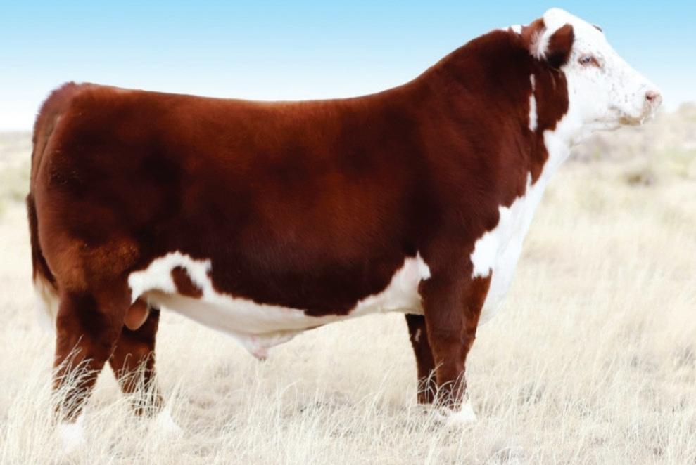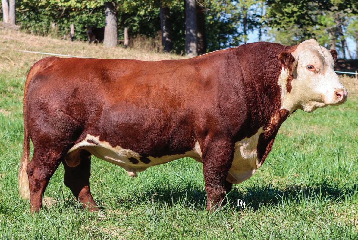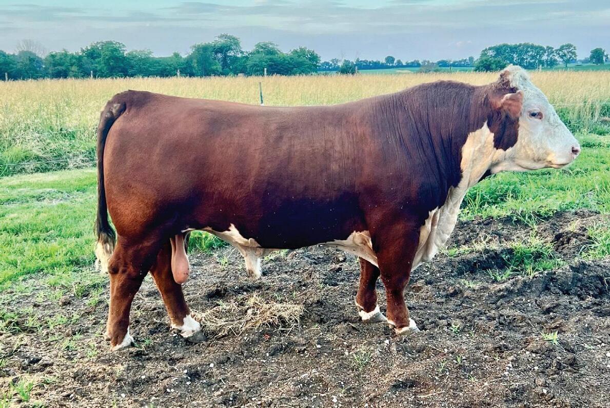 The first calf out of our newest donor, PRCC Faith’s Katie 303L ET. “On the Money” got his name because he was exactly what we were hoping on this first calf. An awesome structured, good-looking, freckle-faced HEIFER BULL with a near double digit calving ease EPD, a .1 BW, and 7 traits (including Udder and Teat) in the top 10% of the breed. We would be keeping this guy ourselves if we didn’t plan on having so many 303L daughters in the future. Consigned by Benedict Herefords, Noah Benedict, 217-372-8009, 605 CR 2300 N., Dewey, IL 61840.
