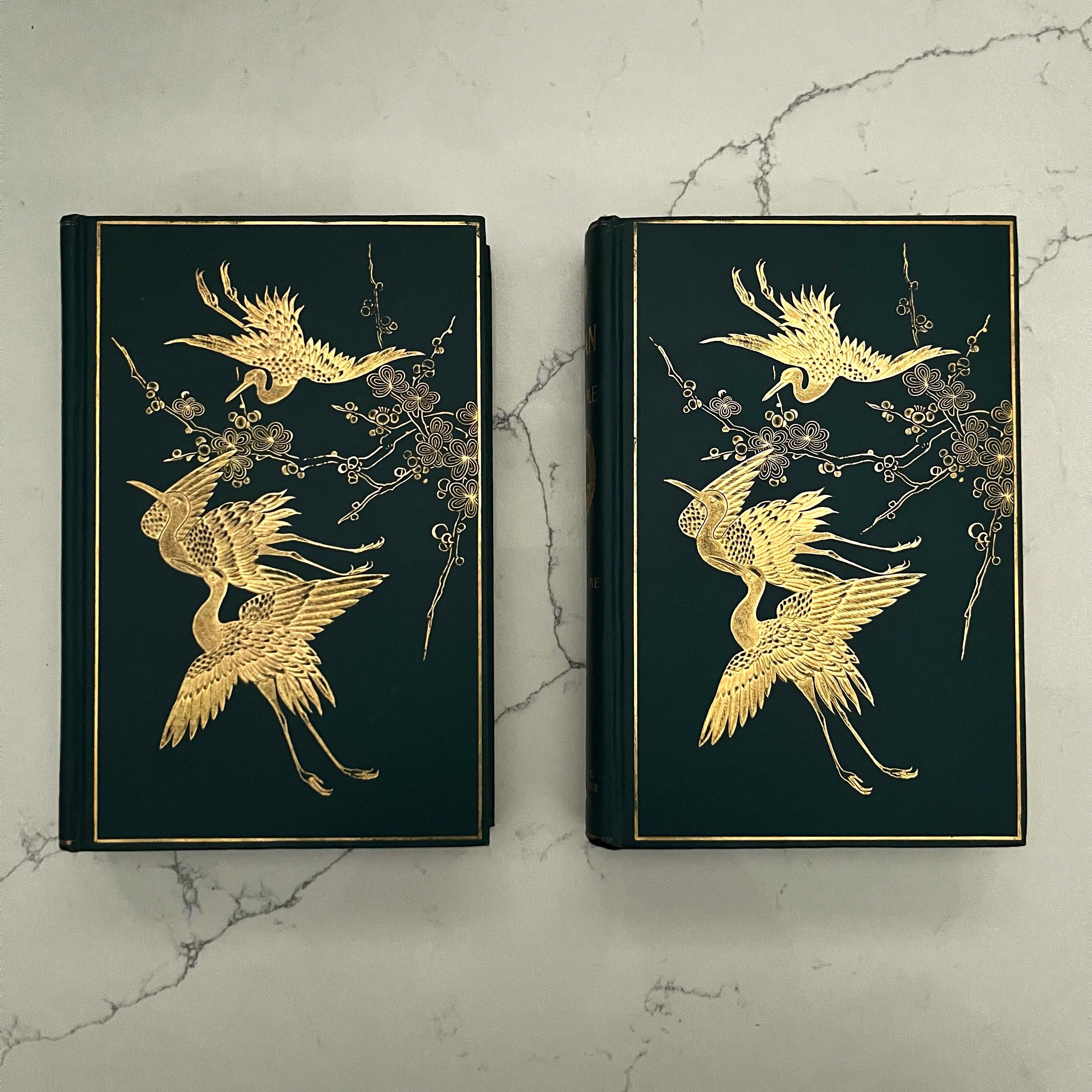 First UK edition in Fine condition of this two-volume study of Japan by Anna C. Hartshorne, published in 1904. Includes fifty original photogravures and descriptions of Japanese cities, as well as the country’s customs, traditions and history, made and taken by this early Western visitor. Exquisite gilt cover on green-blue cloth depicting flying cranes.