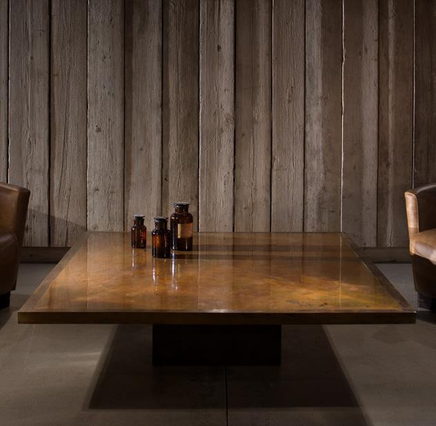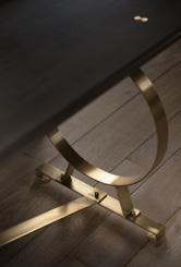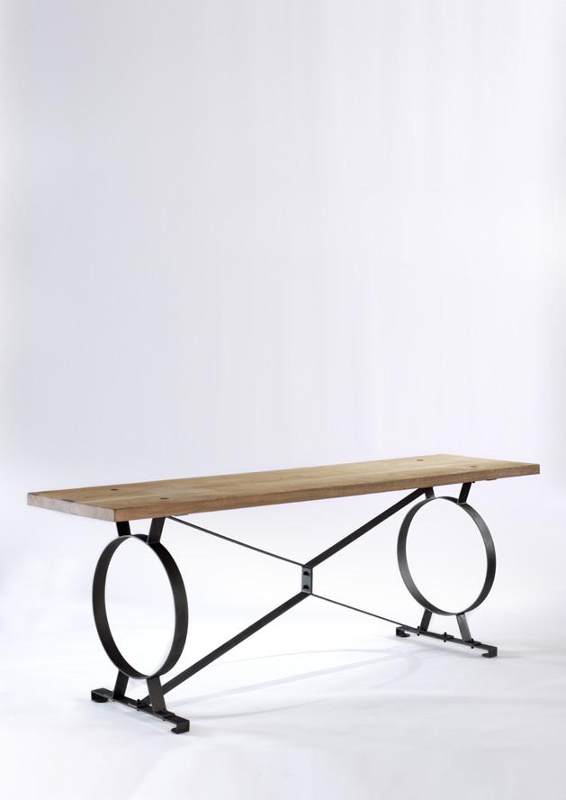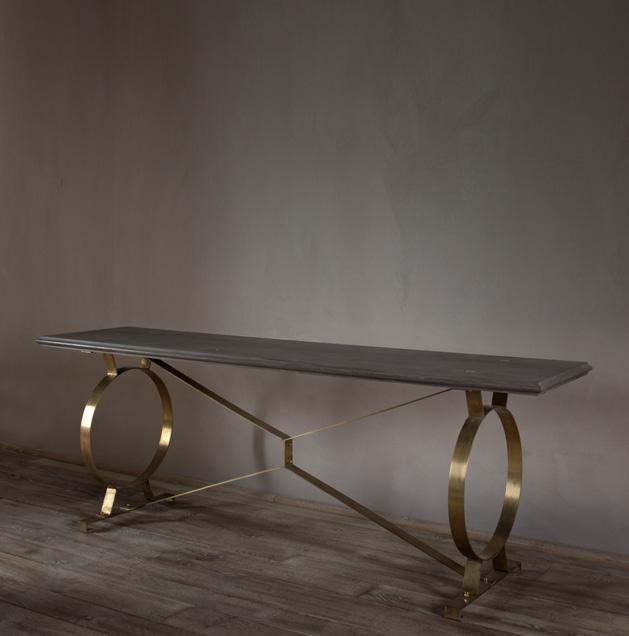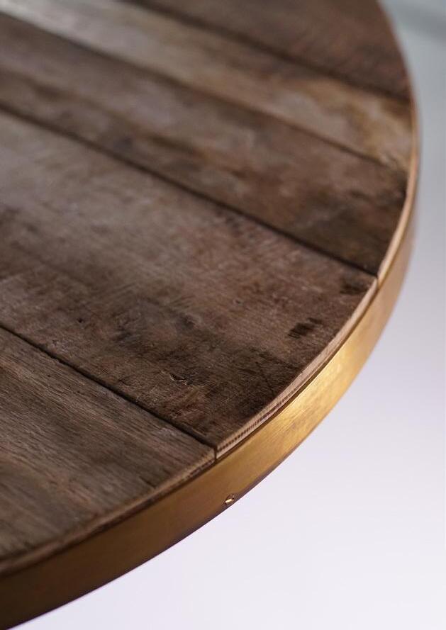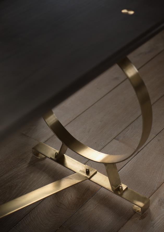 B.B. - I love the reclaimed oak planks in combination with the smooth brass ring frame supported on double ‘X’ legs