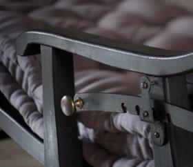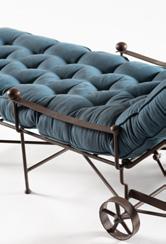 A steel frame with adjustable back, the small wheels enable maneuverability. Generously crafted buttoned cushions for outside use