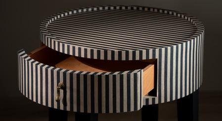 B.B. - A painted oak veneer structure – one central drawer with a pendant pull –a four-leg base with intersecting crossbars. The natural wood is an ideal occasional table while the zebra striped version can add a hint of whimsy