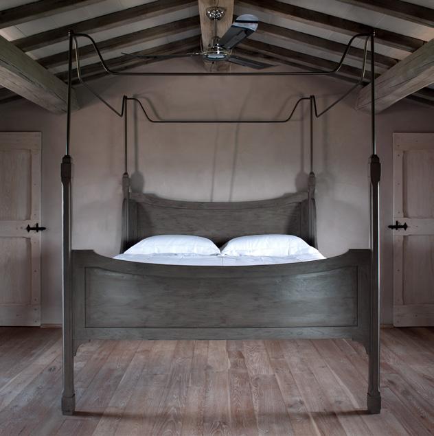 Specifications: oak with plated steel mounts - able to take either a shallow box base divan, or classic Italian sprung slats - Measurements: w-209cm d-129cm h-231cm