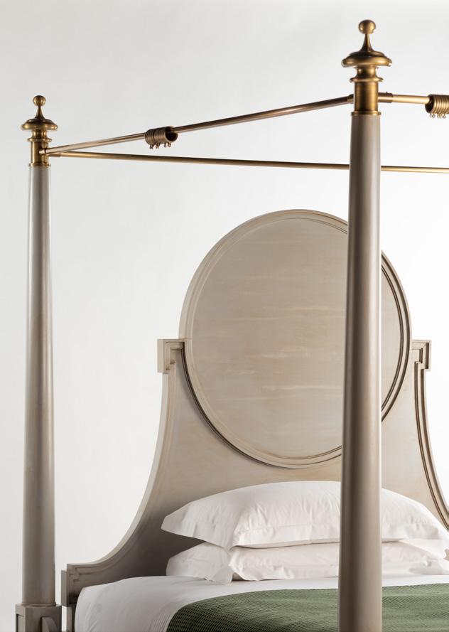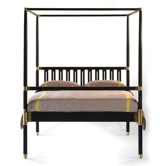 A grisaille beech four-poster bed with brass plated steel superstructure