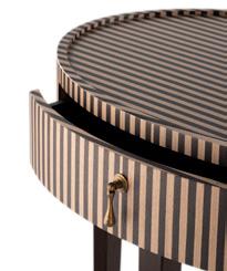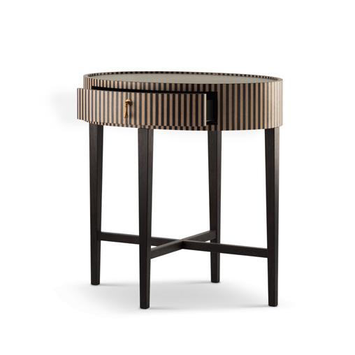 B.B. - The Oval Side Table features a central drawer, with a pendant pull, on a four-leg base with intersecting crossbars. Characterized by soft and sober lines, the natural wood is an ideal occasional table while the zebra striped version can add a hint of whimsy