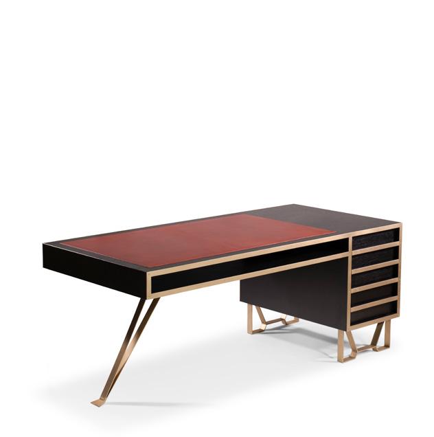 Specifications: painted oak veneer structure - Italian leather inlay - 3mm brushed brass slab profile - legs made from solid 5mm brass slab 4 separate wooden drawers - Measurements: w-185cm d-86cm h-74cm
