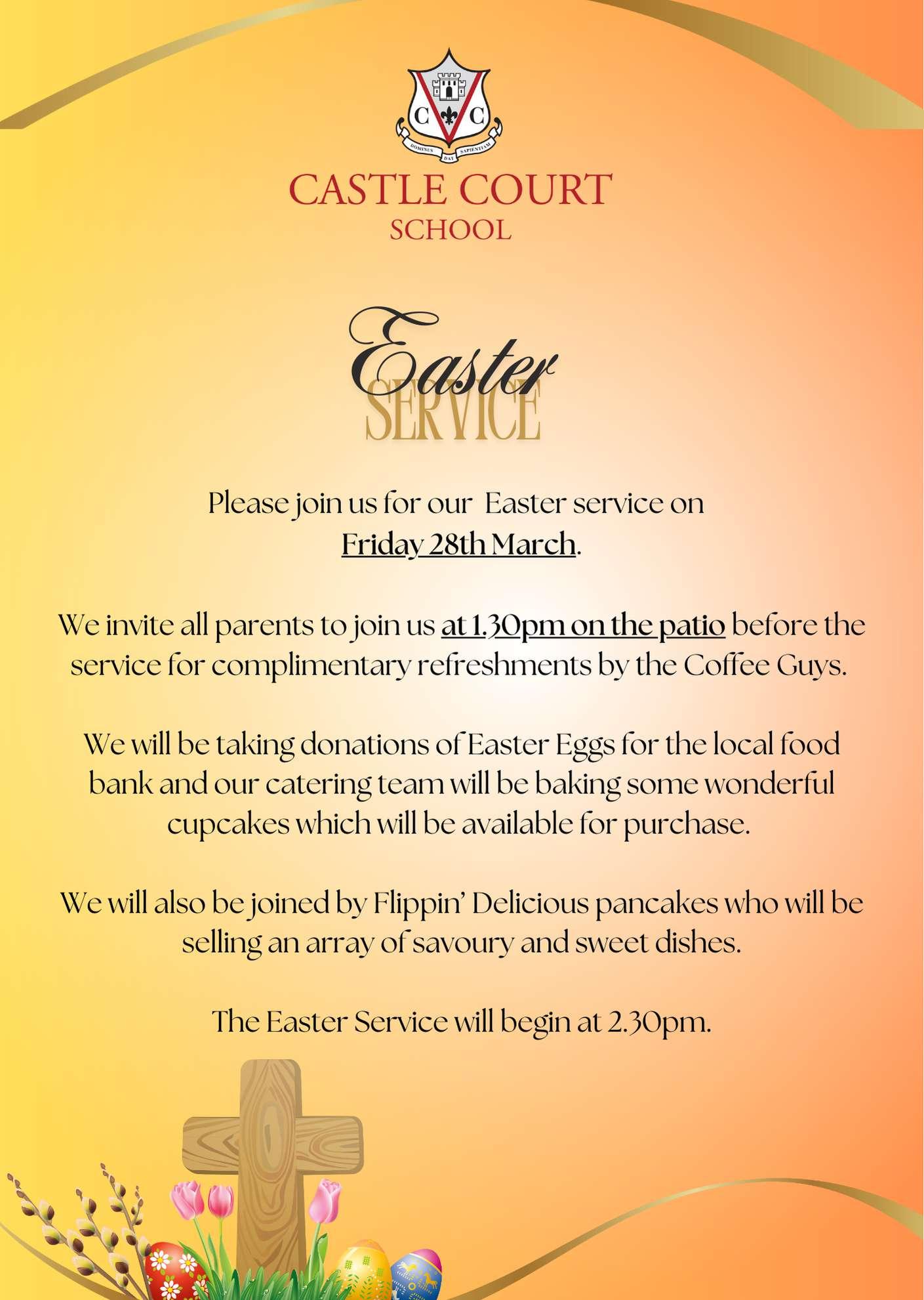 Easter Service: parents are warmly invited to attend Refreshments will be on the patio from 13:30