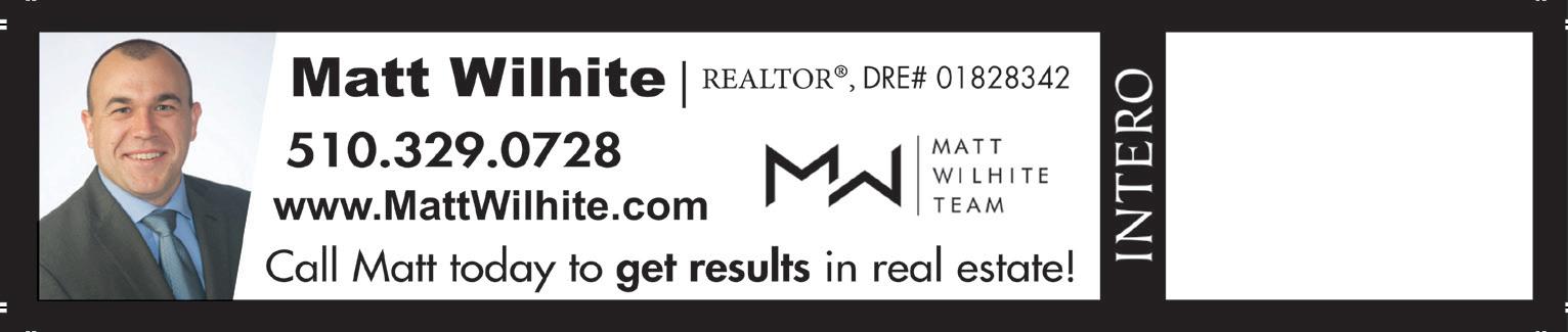 Monthly Dues for Families = $259 Monthly Dues for Singles = $248 Check Out Our Website. Look for All Features & Benefits. WWW.BOVSWIM.COM Join today get one free locker for one year *Previous members of 12 months or less are not eligible for this promo. Not to be combined with any other offers. Full Gym • Over 40 Group-Exercise Classes Lap Swim & Aquatic Classes Included-Plus much more! 1881 Astor Dr., San Leandro, Corner of Astor Dr. & Lake COMMIT YOUR FAMILY TO BE FIT! WE ARE FAMILY ORIENTED COME VISIT OR LOOK ON LINE Gyms and Cardio Indoors and Outdoors 7 Yoga classes a week in person or Zoom When you join early and pay your rst month’s dues. Subject to change without notice. O er exp. 11/30/22 $500 (Family) $300 (Single) NOVEMBER FREE Initiation DISCOUNT Save $100-$300 8 NEW CHAMPIONSHIP PICKLEBALL COURT Sunday, December 11th 10am-4pm Live Music and Light refreshments Light refreshments All Vendors are Local Artists 333Village Dr. Castro Valley, CA 94546 Located in the Castro Valley Village on the corner of Santa Maria and Village Drive Saturday, December 10th 5pm-9pm “Lovewell Team” is a dynamic, award-winning Real Estate team Call 510-351-5555 or visit us at www.Lovewellteam.com — A team you can love and trust — Lovewell Team (CA DRE #00689931, #01912817, #02187163) 2100 105th Avenue, Oakland - $649,000 2 Bedrooms, 1 Bath, 998 Sq. ., Built 1946 Open House Sunday, 12/11, 1-4 pm Almanac Moon Phases Wednesday Sunny High 57° Low 40° Thursday PM Showers High 56° Low 44° Sunday Showers High 52° Low 38° Friday PM Showers High 55° Low 46° Past Week’s Rain: 00.00 Season To Date: 02.40 Normal To Date: 00.00 Season Average: 16.00 Castro Valley Weather December 7 - December 11, 2022 Sun sets at 4:49 p.m. today, rises at 7:11 a.m. Thursday. Saturday Rain High 56° Low 45° Dec 15 Dec 22 Dec 30 Dec 7