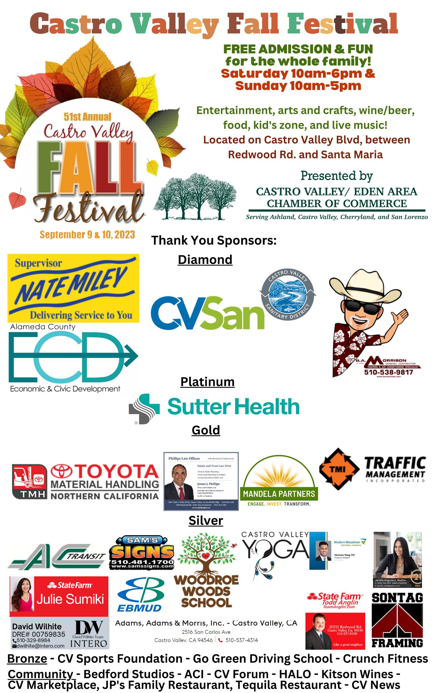 This year’s Fall Festival will take place on Saturday and Sunday, September 9-10 on Castro Valley Boulevard between Redwood Road and Santa Maria Avenue. Visit the Chamber website for more: Edenareachamber.com.