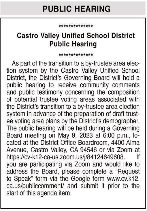 and avoid a lawsuit, CVUSD will hold a series of five public hearings and hire a demographer to divide up Castro Valley into districts using data from the 2020 Census. The first two public hearings (May 9 and May 12) will be held to solicit comments and feedback regarding potential trustee areas. After a few maps are drawn, CVUSD will host three more meetings (June 12, June 14, and June 28) for public comment.