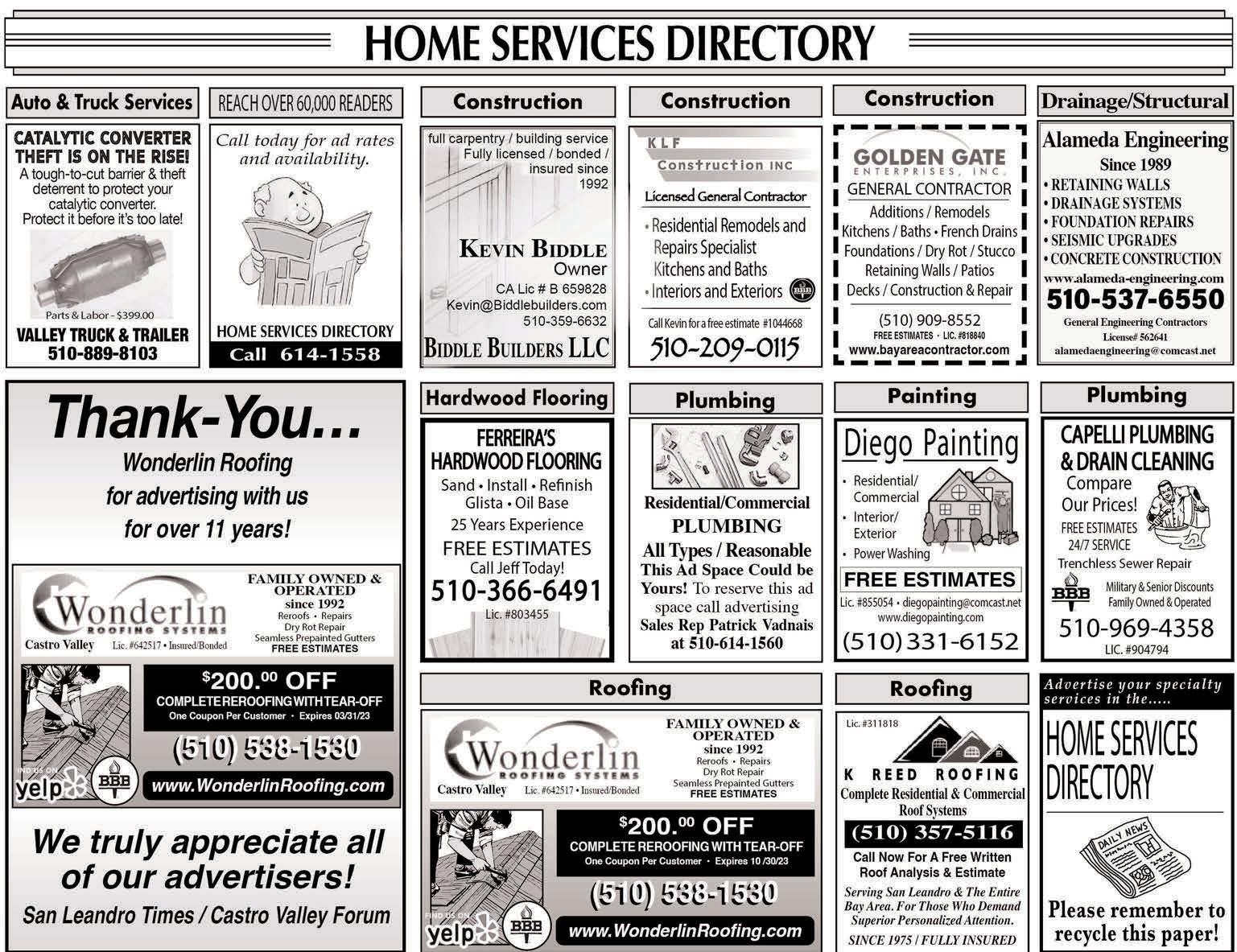 Advertise your Home for rent in the San Leandro Times & Castro Valley Forum DON’T LET ANOTHER WEEK SLIPBY! – Avacancy day is money lost forever –To place an ad call 510-614-1558