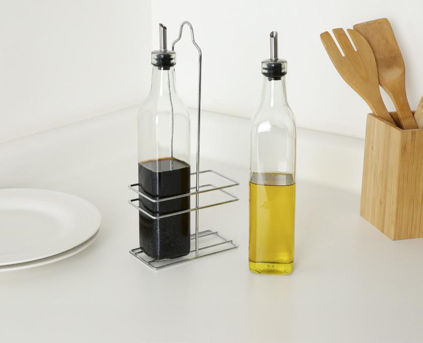 Perfecto para almacenar aceite, vinagre, aderezos o salsas líquidas • Ideal para uso diario y fácil almacenamiento • Fácil de limpiar • Tapa de cierre a presión • 2 botellas de 5 x 30 cm (5 00 ml) • 1 base de 7 x 13 x 30 cm • Transparente, negro y plateado • Vidrio y metal