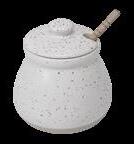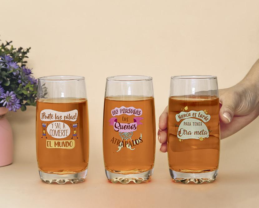 Transparente con verde, rosado y beige • Vidrio y bambú • 3 recipientes con tapa de 8 cm de alto x 8 cm de diámetro (250 ml) • 3 cucharas de 13 cm de largo • 1 base de 10 cm de ancho x 28 cm de largo