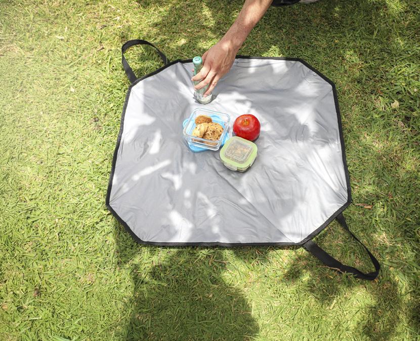 Su diseño permite extenderse completamente, transformándose en un individual para colocar su comida